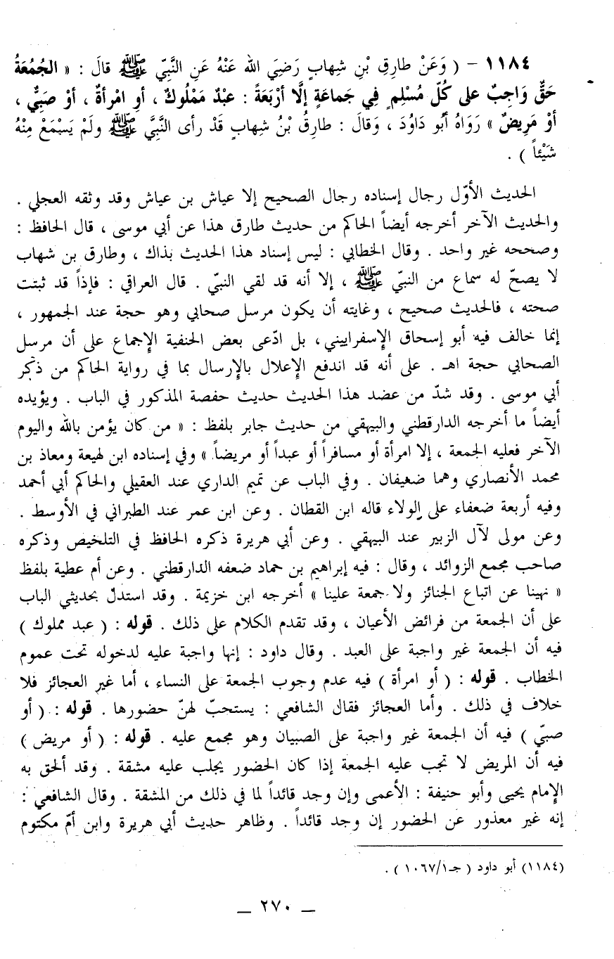 (وَعَنْ طَارِقِ بْنِ شِهَابٍ - رَضِيَ اللَّهُ عَنْهُ - عَنْ النَّبِيِّ - صَلَّى اللَّهُ عَلَيْهِ وَسَلَّمَ - قَالَ: «الْجُمُعَةُ حَقٌّ وَاجِبٌ عَلَى كُلِّ مُسْلِمٍ فِي جَمَاعَةٍ إلَّا أَرْبَعَةً: عَبْدٌ مَمْلُوكٌ، أَوْ امْرَأَةٌ، أَوْ صَبِيٌّ، أَوْ مَرِيضٌ» رَوَاهُ أَبُو دَاوُد، وَقَالَ: طَارِقُ بْنُ شِهَابٍ قَدْ رَأَى النَّبِيَّ - صَلَّى اللَّهُ عَلَيْهِ وَسَلَّمَ - وَلَمْ يَسْمَع مِنْهُ شَيْئًا) .