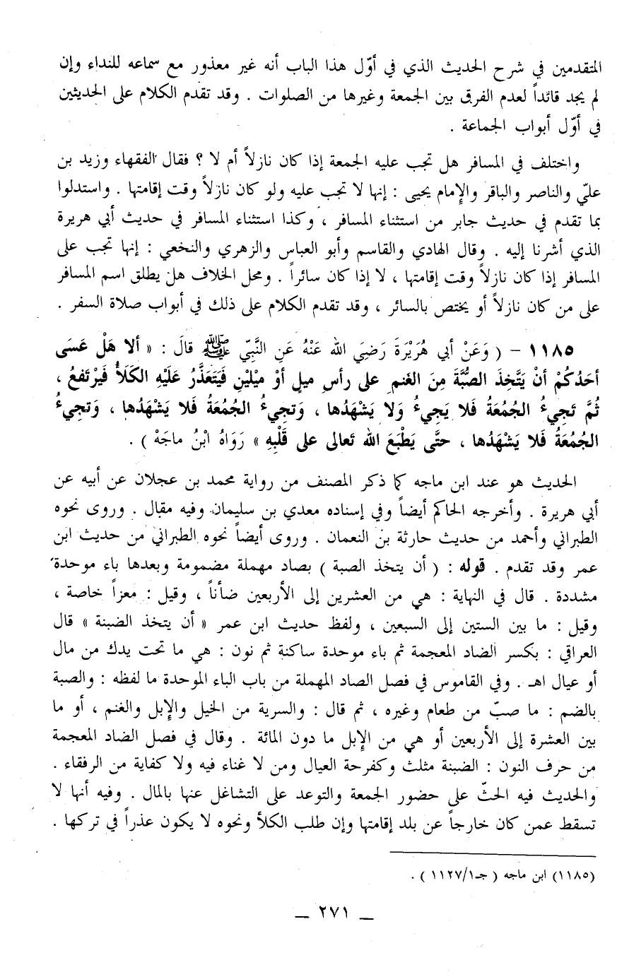 1185 - (وَعَنْ أَبِي هُرَيْرَةَ - رَضِيَ اللَّهُ عَنْهُ - عَنْ النَّبِيِّ - صَلَّى اللَّهُ عَلَيْهِ وَسَلَّمَ - قَالَ: «أَلَا هَلْ عَسَى أَحَدُكُمْ أَنْ يَتَّخِذَ الصُّبَّةَ مِنْ الْغَنَمِ عَلَى رَأْسِ مِيلٍ أَوْ مِيلَيْنِ فَيَتَعَذَّرُ عَلَيْهِ الْكَلَأُ فَيَرْتَفِعُ، ثُمَّ تَجِيءُ الْجُمُعَةُ فَلَا يَجِيءُ وَلَا يَشْهَدُهَا، وَتَجِيءُ الْجُمُعَةُ فَلَا يَشْهَدُهَا، وَتَجِيءُ الْجُمُعَةُ فَلَا يَشْهَدُهَا، حَتَّى يَطْبَعَ اللَّهُ تَعَالَى عَلَى قَلْبِهِ» رَوَاهُ ابْنُ مَاجَهْ) .