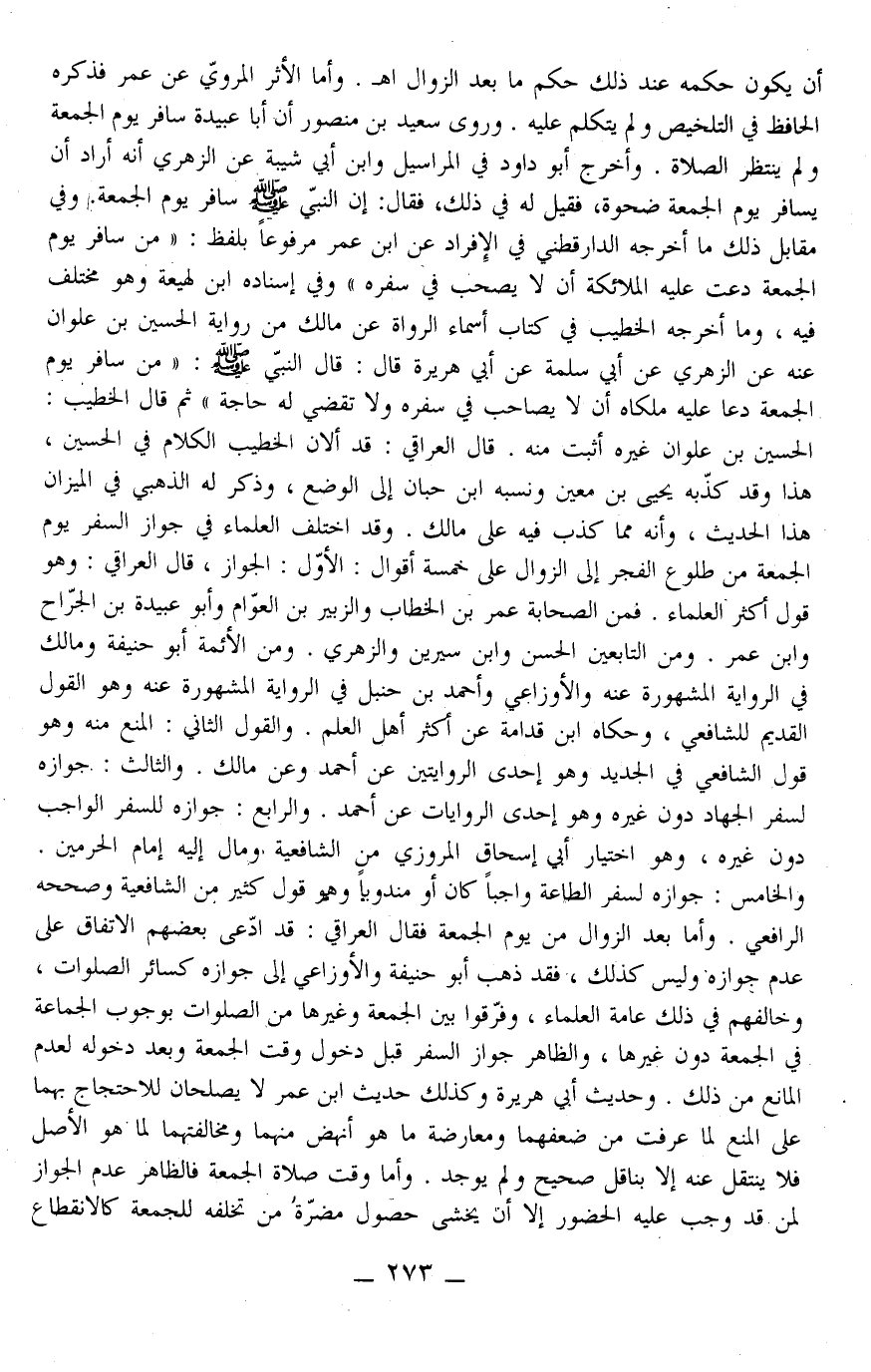 وَأَمَّا الْأَثَر الْمَرْوِيّ عَنْ عُمَرَ فَذَكَره الْحَافِظُ فِي التَّلْخِيصِ وَلَمْ يَتَكَلَّم عَلَيْهِ. وَرَوَى سَعِيدُ بْنُ مَنْصُورٍ أَنَّ أَبَا عُبَيْدَةَ سَافَرَ يَوْم الْجُمُعَة وَلَمْ يَنْتَظِرْ الصَّلَاةَ وَأَخْرَجَ أَبُو دَاوُد فِي الْمَرَاسِيلِ وَابْنُ أَبِي شَيْبَةَ عَنْ الزُّهْرِيِّ أَنَّهُ أَرَادَ أَنْ يُسَافِر يَوْم الْجُمُعَة ضَحْوَة، فَقِيلَ لَهُ فِي ذَلِكَ، فَقَالَ: إنَّ النَّبِيَّ - صَلَّى اللَّهُ عَلَيْهِ وَسَلَّمَ - سَافَرَ يَوْم الْجُمُعَة وَفِي مُقَابِل ذَلِكَ مَا أَخْرَجَهُ الدَّارَقُطْنِيّ فِي الْإِفْرَادِ عَنْ ابْنِ عُمَرَ مَرْفُوعًا بِلَفْظِ: «مَنْ سَافَرَ يَوْمَ الْجُمُعَةِ دَعَتْ عَلَيْهِ الْمَلَائِكَةُ أَنْ لَا يُصْحَبَ فِي سَفَره» وَفِي إسْنَاده ابْنُ لَهِيعَةَ وَهُوَ مُخْتَلَف فِيهِ، وَمَا أَخْرَجَهُ الْخَطِيبُ فِي كِتَابِ أَسْمَاءِ الرُّوَاةِ عَنْ مَالِكٍ مِنْ رِوَايَة الْحُسَيْنِ بْنِ عَلْوَانَ عَنْهُ عَنْ الزُّهْرِيِّ عَنْ أَبِي سَلَمَةَ عَنْ أَبِي هُرَيْرَةَ قَالَ: قَالَ النَّبِيُّ - صَلَّى اللَّهُ عَلَيْهِ وَسَلَّمَ -: «مَنْ سَافَرَ يَوْمَ الْجُمُعَةِ دَعَا عَلَيْهِ مَلَكَاهُ أَنْ لَا يُصَاحَبَ فِي سَفَرِهِ وَلَا تُقْضَى لَهُ حَاجَةٌ» ثُمَّ قَالَ الْخَطِيبُ: الْحُسَيْنُ بْنُ عَلْوَانَ غَيْره أَثْبَت مِنْهُ. قَالَ الْعِرَاقِيُّ: قَدْ أَلَانَ الْخَطِيبُ الْكَلَام فِي الْحُسَيْنِ، هَذَا وَقَدْ كَذَّبَهُ يَحْيَى بْنُ مَعِينٍ وَنَسَبَهُ ابْنُ حِبَّانَ إلَى الْوَضْع، وَذَكَرَ لَهُ الذَّهَبِيُّ فِي الْمِيزَانِ هَذَا الْحَدِيثَ، وَأَنَّهُ مِمَّا كَذَبَ فِيهِ عَلَى مَالِكٍ. وَقَدْ اخْتَلَفَ الْعُلَمَاءُ فِي جَوَاز السَّفَرِ يَوْمَ الْجُمُعَةِ مِنْ طُلُوعِ الْفَجْرِ إلَى الزَّوَالِ عَلَى خَمْسَة أَقْوَال: الْأَوَّل: الْجَوَاز، قَالَ الْعِرَاقِيُّ: وَهُوَ قَوْل أَكْثَر الْعُلَمَاءِ. فَمِنْ الصَّحَابَةِ عُمَرُ بْنُ الْخَطَّابِ وَالزُّبَيْرُ بْنُ الْعَوَامّ وَأَبُو عُبَيْدَةَ بْنُ الْجَرَّاحِ وَابْنُ عُمَرَ. وَمِنْ التَّابِعِينَ الْحَسَنُ وَابْنُ سِيرِينَ وَالزُّهْرِيُّ. وَمِنْ الْأَئِمَّة أَبُو حَنِيفَةَ وَمَالِكٌ فِي الرِّوَايَة الْمَشْهُورَة عَنْهُ وَالْأَوْزَاعِيُّ وَأَحْمَدُ بْنُ حَنْبَلٍ فِي الرِّوَايَة الْمَشْهُورَة عَنْهُ وَهُوَ الْقَوْل الْقَدِيم لِلشَّافِعِيِّ، وَحَكَاهُ ابْنُ قُدَامَةَ عَنْ أَكْثَر أَهْل الْعِلْم.