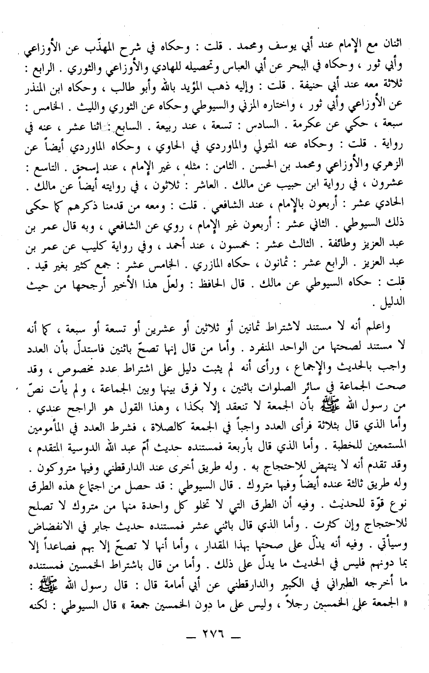 الثَّانِي عَشَر: أَرْبَعُونَ غَيْر الْإِمَام، رُوِيَ عَنْ الشَّافِعِيِّ، وَبِهِ قَالَ عُمَرُ بْنُ عَبْدِ الْعَزِيزِ وَطَائِفَة. الثَّالِثَ عَشَر: خَمْسُونَ، عِنْدَ أَحْمَدَ، وَفِي رِوَايَة كُلَيْبٍ عَنْ عُمَرَ بْنِ عَبْدِ الْعَزِيزِ. الرَّابِع عَشَر: ثَمَانُونَ، حَكَاهُ الْمَازِرِيُّ. الْخَامِس عَشَر: جَمْعٌ كَثِيرٌ بِغَيْرِ قَيْد. قُلْت: حَكَاهُ السُّيُوطِيّ عَنْ مَالِكٍ قَالَ الْحَافِظُ: وَلَعَلَّ هَذَا الْأَخِير أَرْجَحهَا مِنْ حَيْثُ الدَّلِيل