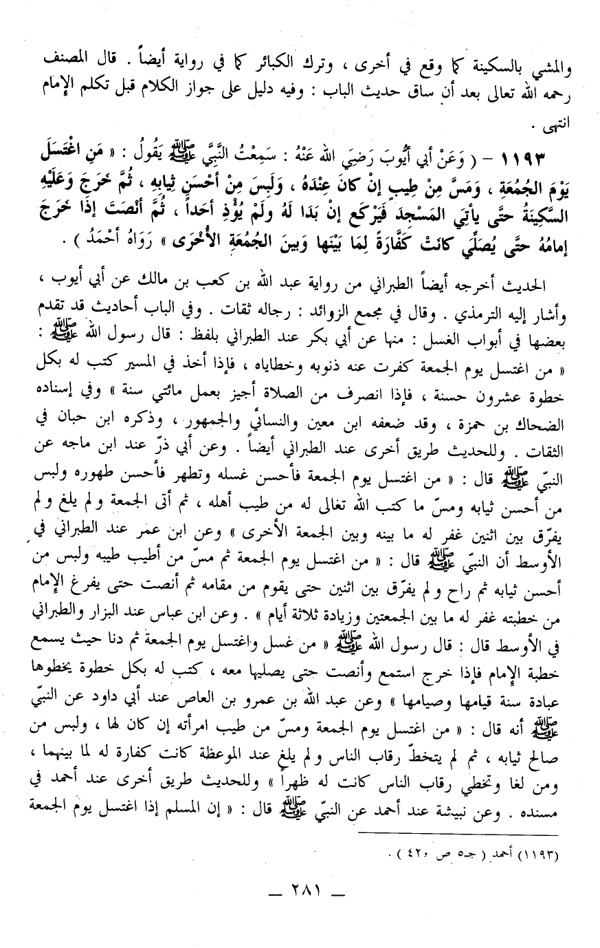 1193 - (وَعَنْ أَبِي أَيُّوبَ - رَضِيَ اللَّهُ عَنْهُ -: سَمِعْت النَّبِيَّ - صَلَّى اللَّهُ عَلَيْهِ وَسَلَّمَ - يَقُولُ: «مَنْ اغْتَسَلَ يَوْمَ الْجُمُعَةِ، وَمَسَّ مِنْ طِيبٍ إنْ كَانَ عِنْدَهُ، وَلَبِسَ مِنْ أَحْسَنِ ثِيَابِهِ، ثُمَّ خَرَجَ وَعَلَيْهِ السَّكِينَةُ حَتَّى يَأْتِيَ الْمَسْجِدَ فَيَرْكَعَ إنْ بَدَا لَهُ وَلَمْ يُؤْذِ أَحَدًا، ثُمَّ أَنْصَتَ إذَا خَرَجَ إمَامُهُ حَتَّى يُصَلِّيَ كَانَتْ كَفَّارَة لِمَا بَيْنَهَا وَبَيْنَ الْجُمُعَة الْأُخْرَى» رَوَاهُ أَحْمَدُ) .