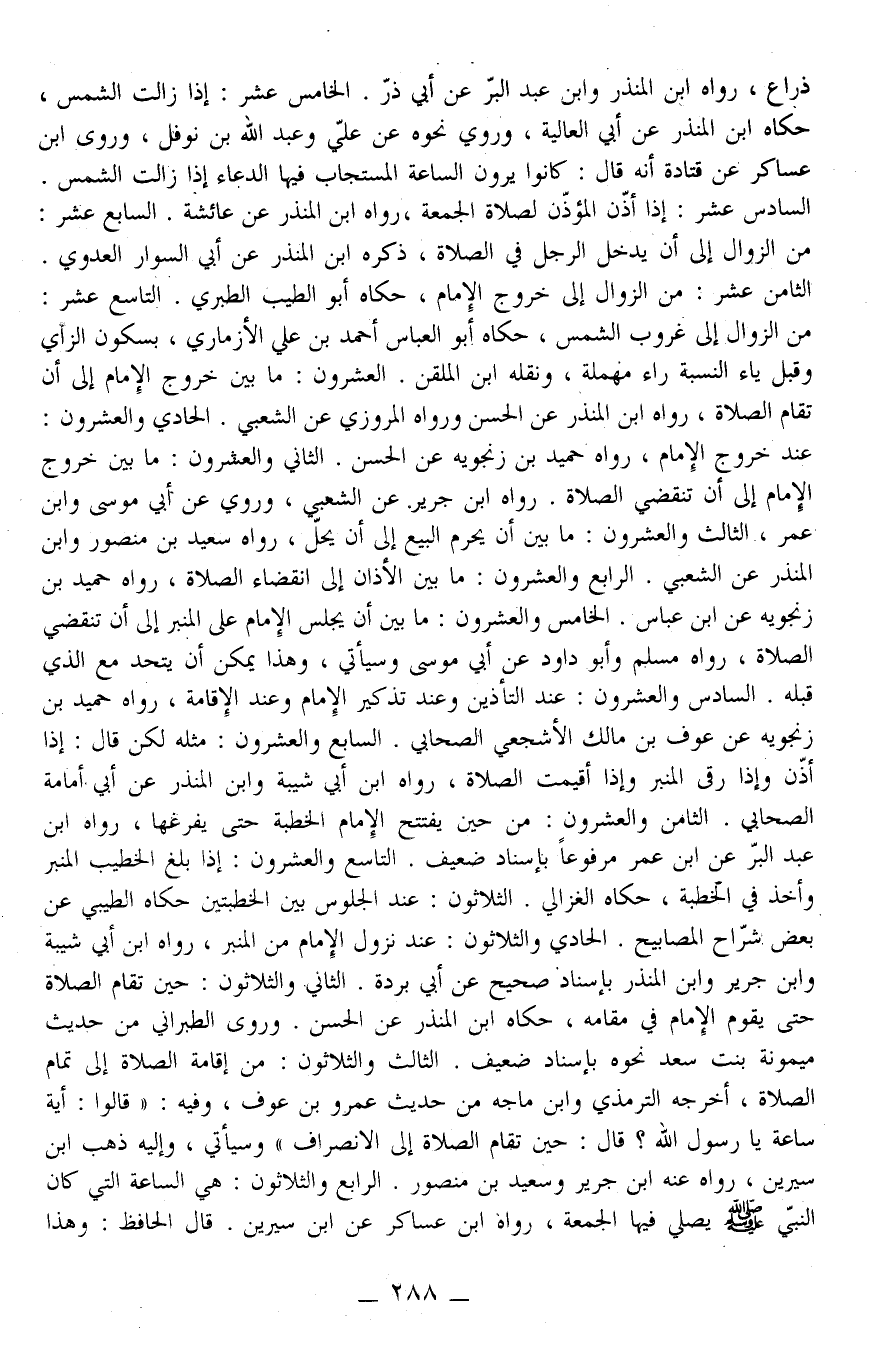 الرَّابِع وَالثَّلَاثُونَ: هِيَ السَّاعَة الَّتِي كَانَ النَّبِيّ - صَلَّى اللَّهُ عَلَيْهِ وَسَلَّمَ - يُصَلِّي فِيهَا الْجُمُعَة، رَوَاهُ ابْنُ عَسَاكِرَ عَنْ ابْنِ سِيرِينَ. قَالَ الْحَافِظُ: وَهَذَا