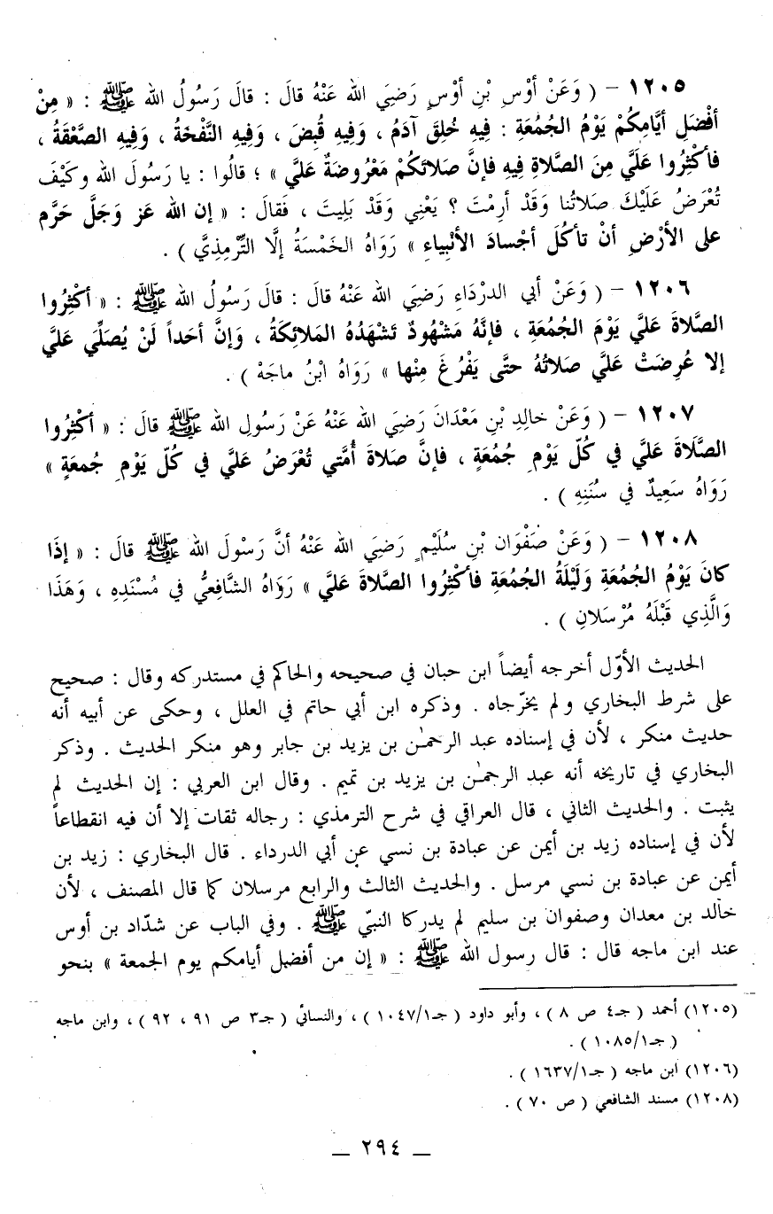 1205 - (وَعَنْ أَوْسِ بْنِ أَوْسٍ - رَضِيَ اللَّهُ عَنْهُ - قَالَ: قَالَ رَسُولُ اللَّهِ - صَلَّى اللَّهُ عَلَيْهِ وَسَلَّمَ -: «مِنْ أَفْضَلِ أَيَّامِكُمْ يَوْمُ الْجُمُعَةِ: فِيهِ خُلِقَ آدَم، وَفِيهِ قُبِضَ، وَفِيهِ النَّفْخَةُ، وَفِيهِ الصَّعْقَةُ، فَأَكْثِرُوا عَلَيَّ مِنْ الصَّلَاةِ فِيهِ فَإِنَّ صَلَاتَكُمْ مَعْرُوضَةٌ عَلَيَّ، قَالُوا: يَا رَسُولَ اللَّهِ وَكَيْف تُعْرَضُ عَلَيْك صَلَاتُنَا وَقَدْ أَرِمْتَ؟ يَعْنِي وَقَدْ بَلِيتَ، فَقَالَ: إنَّ اللَّهَ عَزَّ وَجَلَّ حَرَّمَ عَلَى الْأَرْضِ أَنْ تَأْكُلَ أَجْسَادَ الْأَنْبِيَاءِ» رَوَاهُ الْخَمْسَة إلَّا التِّرْمِذِيَّ) .