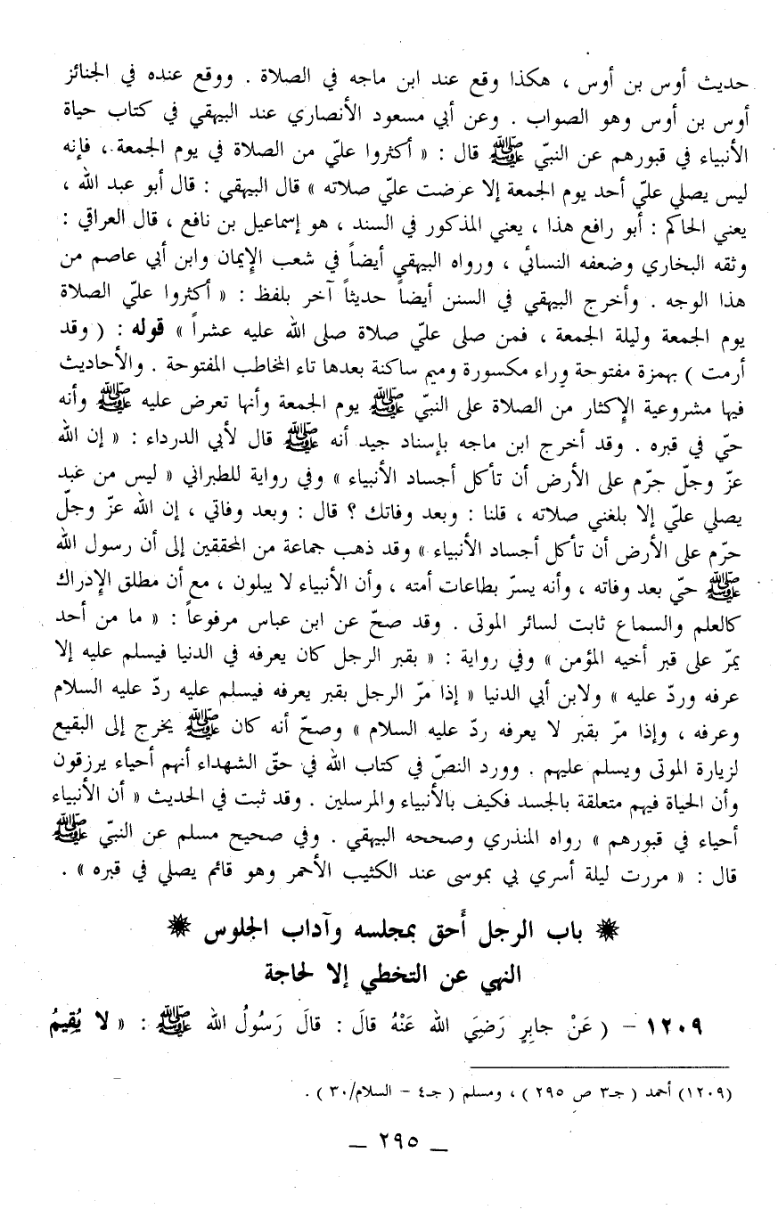 وَقَدْ أَخْرَجَ ابْنُ مَاجَهْ بِإِسْنَادٍ جَيِّد أَنَّهُ - صَلَّى اللَّهُ عَلَيْهِ وَسَلَّمَ - قَالَ لِأَبِي الدَّرْدَاءِ: «إنَّ اللَّهَ عَزَّ وَجَلَّ حَرَّمَ عَلَى الْأَرْضِ أَنْ تَأْكُلَ أَجْسَادَ الْأَنْبِيَاءِ» وَفِي رِوَايَة لِلطَّبَرَانِيِّ «لَيْسَ مِنْ عَبْدٍ يُصَلِّي عَلَيَّ إلَّا بَلَغَنِي صَلَاتُهُ، قُلْنَا: وَبَعْدَ وَفَاتِك؟ قَالَ: وَبَعْدَ وَفَاتِي، إنَّ اللَّهَ عَزَّ وَجَلَّ حَرَّمَ عَلَى الْأَرْضِ أَنْ تَأْكُلَ أَجْسَادَ الْأَنْبِيَاءِ» وَقَدْ ذَهَبَ جَمَاعَة مِنْ الْمُحَقِّقِينَ إلَى أَنَّ رَسُولَ اللَّه - صَلَّى اللَّهُ عَلَيْهِ وَسَلَّمَ - حَيّ بَعَدَ وَفَاته، وَأَنَّهُ يُسَرُّ بِطَاعَاتِ أُمَّته، وَأَنَّ الْأَنْبِيَاءَ لَا يُبْلَوْنَ، مَعَ أَنَّ مُطْلَق الْإِدْرَاك كَالْعِلْمِ وَالسَّمَاع ثَابِت لِسَائِرِ الْمَوْتَى.