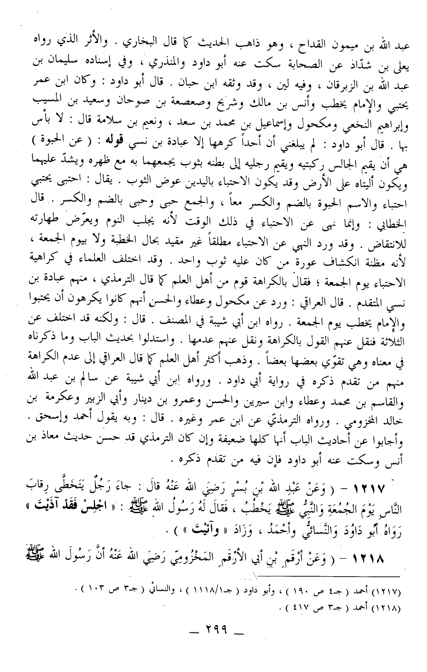 1217 - (وَعَنْ عَبْدِ اللَّهِ بْنِ بُسْرٍ - رَضِيَ اللَّهُ عَنْهُ - قَالَ: «جَاءَ رَجُلٌ يَتَخَطَّى رِقَابَ النَّاسِ يَوْمَ الْجُمُعَةِ وَالنَّبِيُّ - صَلَّى اللَّهُ عَلَيْهِ وَسَلَّمَ - يَخْطُبُ، فَقَالَ لَهُ رَسُولُ اللَّهِ - صَلَّى اللَّهُ عَلَيْهِ وَسَلَّمَ -: اجْلِسْ فَقَدْ آذَيْتَ» رَوَاهُ أَبُو دَاوُد وَالنَّسَائِيُّ وَأَحْمَدُ، وَزَادَ " وَآنَيْتَ ") .