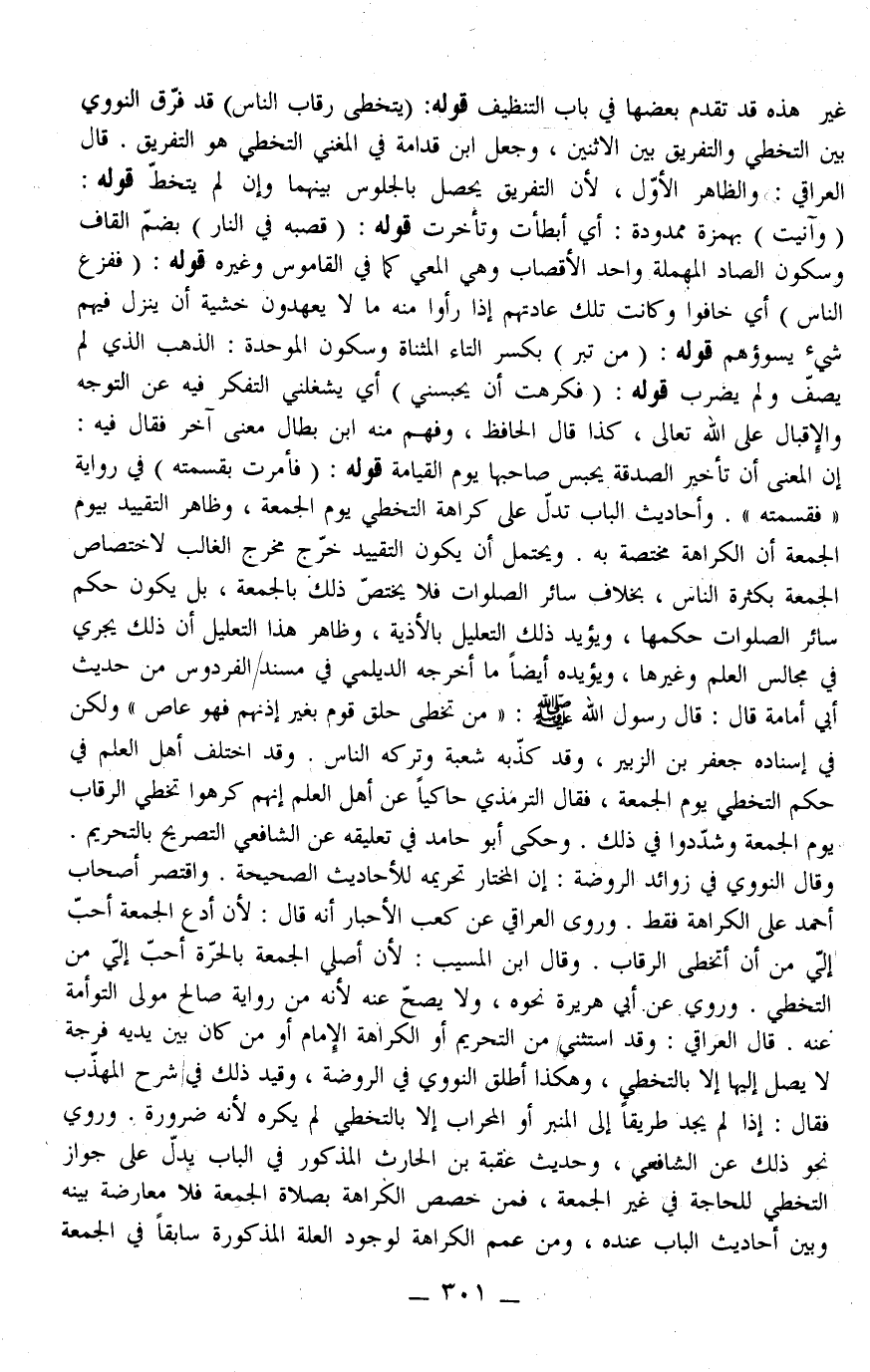 وَأَحَادِيثُ الْبَابِ تَدُلّ عَلَى كَرَاهَة التَّخَطِّي يَوْمَ الْجُمُعَة، وَظَاهِر التَّقْيِيد بِيَوْمِ الْجُمُعَة أَنَّ الْكَرَاهَة مُخْتَصَّة بِهِ. وَيُحْتَمَل أَنْ يَكُون التَّقْيِيد خَرَجَ مَخْرَج الْغَالِبِ لِاخْتِصَاصِ الْجُمُعَة بِكَثْرَةِ النَّاس، بِخِلَافِ سَائِر الصَّلَوَات فَلَا يَخْتَصّ ذَلِكَ بِالْجُمُعَةِ، بَلْ يَكُون حُكْم سَائِر الصَّلَوَات حُكْمهَا، وَيُؤَيِّدُ ذَلِكَ التَّعْلِيل بِالْأَذِيَّةِ، وَظَاهِر هَذَا التَّعْلِيل أَنَّ ذَلِكَ يَجْرِي فِي مَجَالِس الْعِلْم وَغَيْرهَا، وَيُؤَيِّدهُ أَيْضًا مَا أَخْرَجَهُ الدَّيْلَمِيُّ فِي مُسْنَدِ الْفِرْدَوْسِ مِنْ حَدِيثِ أَبِي أُمَامَةَ قَالَ: قَالَ رَسُولُ اللَّهِ - صَلَّى اللَّهُ عَلَيْهِ وَسَلَّمَ -: «مَنْ تَخَطَّى حَلَقَ قَوْمٍ بِغَيْرِ إذْنِهِمْ فَهُوَ عَاصِ» وَلَكِنْ فِي إسْنَاده جَعْفَرُ بْنُ الزُّبَيْرِ، وَقَدْ كَذَّبَهُ شُعْبَة وَتَرَكَهُ النَّاس.