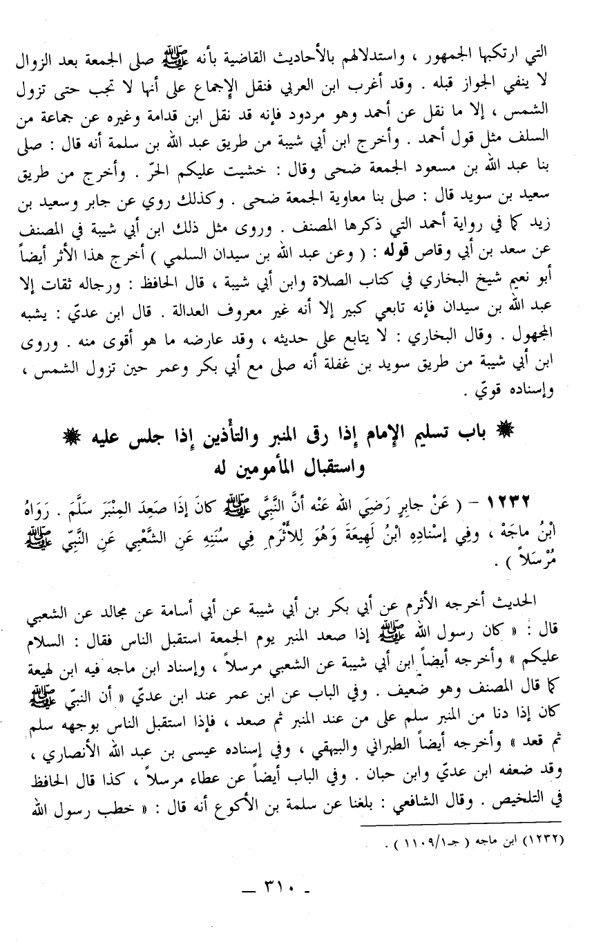 1232 - (عَنْ جَابِرٍ - رَضِيَ اللَّهُ عَنْهُ - «أَنَّ النَّبِيَّ - صَلَّى اللَّهُ عَلَيْهِ وَسَلَّمَ - كَانَ إذَا صَعِدَ الْمِنْبَرَ سَلَّمَ.» رَوَاهُ ابْنُ مَاجَهْ، وَفِي إسْنَادِهِ ابْنُ لَهِيعَةَ وَهُوَ لِلْأَثْرَمِ فِي سُنَنِهِ عَنْ الشَّعْبِيِّ عَنْ النَّبِيِّ - صَلَّى اللَّهُ عَلَيْهِ وَسَلَّمَ - مُرْسَلًا) .