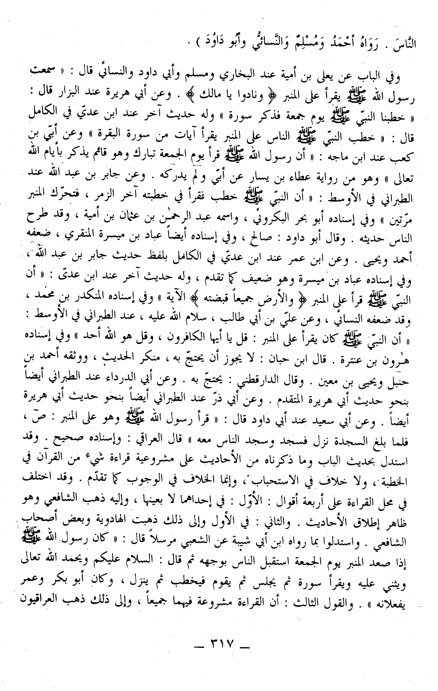 وَعَنْ أَبِي هُرَيْرَةَ عِنْدَ الْبَزَّارِ قَالَ: «خَطَبَنَا النَّبِيُّ - صَلَّى اللَّهُ عَلَيْهِ وَسَلَّمَ - يَوْمَ جُمُعَةٍ فَذَكَرَ سُورَةً» وَلَهُ حَدِيثٌ آخَرُ عِنْدَ ابْنِ عَدِيٍّ فِي الْكَامِلِ قَالَ: «خَطَبَ النَّبِيُّ - صَلَّى اللَّهُ عَلَيْهِ وَسَلَّمَ - النَّاسَ عَلَى الْمِنْبَرِ يَقْرَأُ آيَاتٍ مِنْ سُورَةِ الْبَقَرَة» وَعَنْ أُبَيِّ بْنِ كَعْبٍ عِنْدَ ابْنِ مَاجَهْ: «أَنَّ رَسُولَ اللَّهِ - صَلَّى اللَّهُ عَلَيْهِ وَسَلَّمَ - قَرَأَ يَوْمَ الْجُمُعَةِ تَبَارَكَ وَهُوَ قَائِمٌ يُذَكِّرُ بِأَيَّامِ اللَّهِ تَعَالَى» وَهُوَ مِنْ رِوَايَة عَطَاءِ بْنِ يَسَارٍ عَنْ أُبَيٍّ وَلَمْ يُدْرِكْهُ وَعَنْ جَابِرِ بْنِ عَبْدِ اللَّهِ عِنْدَ الطَّبَرَانِيِّ فِي الْأَوْسَطِ: «أَنَّ النَّبِيَّ - صَلَّى اللَّهُ عَلَيْهِ وَسَلَّمَ - خَطَبَ فَقَرَأَ فِي خُطْبَتِهِ آخِرَ الزُّمَرِ، فَتَحَرَّكَ الْمِنْبَرُ مَرَّتَيْنِ» وَفِي إسْنَادِهِ أَبُو بَحْرٍ الْبَكْرَاوِيُّ، وَاسْمُهُ عَبْدُ الرَّحْمَنِ بْنُ عُثْمَانَ بْنِ أُمَيَّةَ، وَقَدْ طَرَحَ النَّاسُ حَدِيثَهُ. وَقَالَ أَبُو دَاوُد: صَالِحٌ، وَفِي إسْنَادِهِ أَيْضًا عَبَّادُ بْنُ مَيْسَرَةَ الْمُنْقِرِيُّ، ضَعَّفَهُ أَحْمَدُ وَيَحْيَى وَعَنْ ابْنِ عُمَرَ عِنْدَ ابْنِ عَدِيٍّ فِي الْكَامِلِ بِلَفْظِ حَدِيثِ جَابِرِ بْنِ عَبْدِ اللَّهِ، وَفِي إسْنَادِهِ عَبَّادُ بْنُ مَيْسَرَةَ وَهُوَ ضَعِيفٌ كَمَا تَقَدَّمَ، وَلَهُ حَدِيثٌ آخَرُ عِنْدَ ابْنِ عَدِيٍّ: «أَنَّ النَّبِيَّ - صَلَّى اللَّهُ عَلَيْهِ وَسَلَّمَ - قَرَأَ عَلَى الْمِنْبَرِ {وَالأَرْضُ جَمِيعًا قَبْضَتُهُ} [الزمر: 67] الْآيَةَ» وَفِي إسْنَادِهِ الْمُنْكَدِرُ بْنُ مُحَمَّدٍ، وَقَدْ ضَعَّفَهُ النَّسَائِيّ، وَعَنْ عَلِيِّ بْنِ أَبِي طَالِبٍ، سَلَامُ اللَّهِ عَلَيْهِ، عِنْدَ الطَّبَرَانِيِّ فِي الْأَوْسَطِ: أَنَّ «النَّبِيَّ - صَلَّى اللَّهُ عَلَيْهِ وَسَلَّمَ - كَانَ يَقْرَأُ عَلَى الْمِنْبَرِ: {قُلْ يَا أَيُّهَا الْكَافِرُونَ} [الكافرون: 1] ، وَ {قُلْ هُوَ اللَّهُ أَحَدٌ} [الإخلاص: 1] » وَفِي إسْنَادِهِ هَارُونُ بْنُ عَنْتَرَةَ قَالَ ابْنُ حِبَّانَ: لَا يَجُوزُ أَنْ يُحْتَجَّ بِهِ، مُنْكَرُ الْحَدِيثِ، وَوَثَّقَهُ أَحْمَدُ بْنُ حَنْبَلٍ وَيَحْيَى بْنُ مَعِينٍ. وَقَالَ الدَّارَقُطْنِيّ: يُحْتَجُّ بِهِ وَعَنْ أَبِي الدَّرْدَاءِ عِنْدَ الطَّبَرَانِيِّ أَيْضًا بِنَحْوِ حَدِيثِ أَبِي هُرَيْرَة الْمُتَقَدِّمِ. وَعَنْ أَبِي ذَرٍّ عِنْدَ الطَّبَرَانِيِّ أَيْضًا بِنَحْوِ حَدِيثِ أَبِي هُرَيْرَةَ أَيْضًا وَعَنْ أَبِي سَعِيدٍ عِنْدَ أَبِي دَاوُد قَالَ: «قَرَأَ رَسُولُ اللَّهِ - صَلَّى اللَّهُ عَلَيْهِ وَسَلَّمَ - وَهُوَ عَلَى الْمِنْبَرِ: ص، فَلَمَّا بَلَغَ السَّجْدَةَ نَزَلَ فَسَجَدَ وَسَجَدَ النَّاسُ مَعَهُ» قَالَ الْعِرَاقِيُّ: وَإِسْنَادُهُ صَحِيحٌ. وَقَدْ اُسْتُدِلَّ بِحَدِيثِ الْبَابِ وَمَا ذَكَرْنَاهُ مِنْ الْأَحَادِيثِ عَلَى مَشْرُوعِيَّةِ قِرَاءَةِ شَيْءٍ مِنْ الْقُرْآنِ فِي الْخُطْبَةِ، وَلَا خِلَافَ فِي الِاسْتِحْبَابِ، وَإِنَّمَا الْخِلَافُ فِي الْوُجُوبِ كَمَا تَقَدَّمَ.