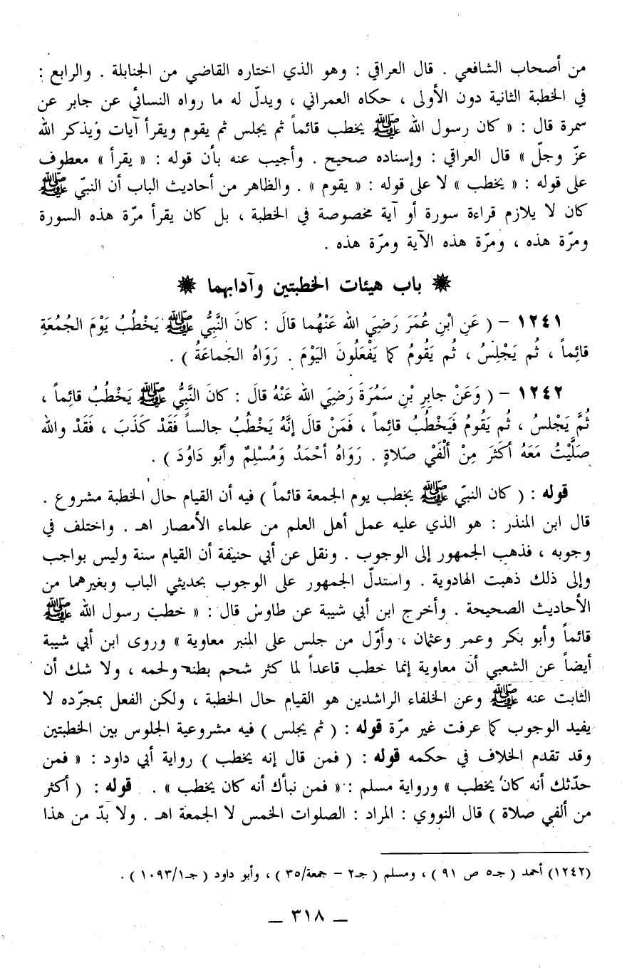1241 - (عَنْ ابْنِ عُمَرَ - رَضِيَ اللَّهُ عَنْهُمَا - قَالَ: كَانَ النَّبِيُّ - صَلَّى اللَّهُ عَلَيْهِ وَسَلَّمَ - «يَخْطُبُ يَوْمَ الْجُمُعَةِ قَائِمًا، ثُمَّ يَجْلِسُ، ثُمَّ يَقُومُ كَمَا يَفْعَلُونَ الْيَوْمَ» رَوَاهُ الْجَمَاعَةُ) .