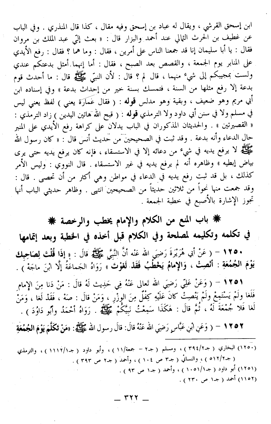 بَابُ الْمَنْعِ مِنْ الْكَلَامِ وَالْإِمَامُ يَخْطُبُ وَالرُّخْصَةِ فِي تَكَلُّمِهِ وَتَكْلِيمِهِ لِمَصْلَحَةٍ وَفِي الْكَلَامِ قَبْلَ أَخْذِهِ فِي الْخُطْبَةِ وَبَعْدَ إتْمَامِهَا