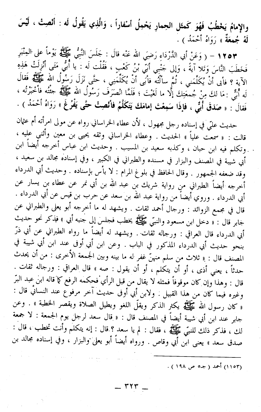 1253 - (وَعَنْ أَبِي الدَّرْدَاءِ - رَضِيَ اللَّهُ عَنْهُ - قَالَ: «جَلَسَ النَّبِيُّ - صَلَّى اللَّهُ عَلَيْهِ وَسَلَّمَ - يَوْمًا عَلَى الْمِنْبَرِ فَخَطَبَ النَّاسَ وَتَلَا آيَةً، وَإِلَى جَنْبِي أُبَيّ بْنُ كَعْبٍ، فَقُلْتُ لَهُ: يَا أُبَيّ مَتَى أُنْزِلَتْ هَذِهِ الْآيَةُ؟ فَأَبَى أَنْ يُكَلِّمَنِي، ثُمَّ سَأَلْتُهُ فَأَبَى أَنْ يُكَلِّمَنِي، حَتَّى نَزَلَ رَسُولُ اللَّهِ - صَلَّى اللَّهُ عَلَيْهِ وَسَلَّمَ - فَقَالَ لَهُ: أُبَيّ، مَا لَكَ مِنْ جُمُعَتِكَ إلَّا مَا لَغَيْتَ. فَلَمَّا انْصَرَفَ رَسُولُ اللَّهِ - صَلَّى اللَّهُ عَلَيْهِ وَسَلَّمَ - جِئْتُهُ فَأَخْبَرْتُهُ، فَقَالَ: صَدَقَ أُبَيٌّ، فَإِذَا سَمِعْت إمَامَكَ يَتَكَلَّمُ فَأَنْصِتْ حَتَّى يَفْرُغَ» رَوَاهُ أَحْمَدُ) .