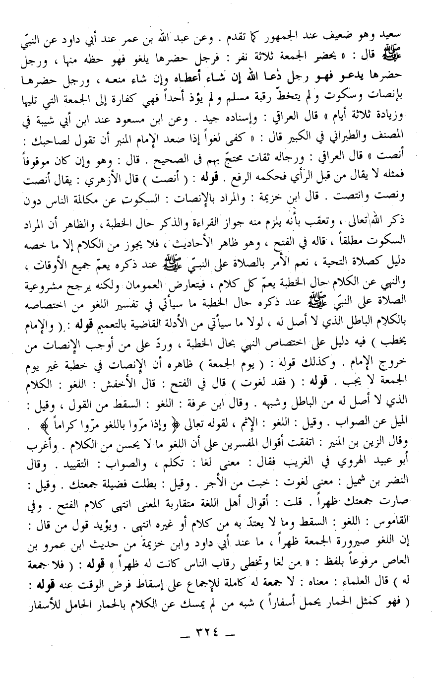 ، وَتُعُقِّبَ بِأَنَّهُ يَلْزَمُ مِنْهُ جَوَازُ الْقِرَاءَةِ وَالذِّكْرِ حَالَ الْخُطْبَةِ، وَالظَّاهِرُ أَنَّ الْمُرَادَ السُّكُوتُ مُطْلَقًا، قَالَهُ فِي الْفَتْحِ، وَهُوَ ظَاهِرُ الْأَحَادِيثِ، فَلَا يَجُوزُ مِنْ الْكَلَامِ إلَّا مَا خَصَّهُ دَلِيلٌ كَصَلَاةِ التَّحِيَّةِ، نَعَمْ الْأَمْرُ بِالصَّلَاةِ عَلَى النَّبِيِّ - صَلَّى اللَّهُ عَلَيْهِ وَسَلَّمَ - عِنْدَ ذِكْرِهِ يَعُمُّ جَمِيعَ الْأَوْقَاتِ، وَالنَّهْيُ عَنْ الْكَلَامِ حَالَ الْخُطْبَةِ يَعُمُّ كُلَّ كَلَامٍ، فَيَتَعَارَضُ الْعُمُومَانِ وَلَكِنَّهُ يُرَجَّحُ مَشْرُوعِيَّةُ الصَّلَاةِ عَلَى النَّبِيِّ - صَلَّى اللَّهُ عَلَيْهِ وَسَلَّمَ - عِنْدَ ذِكْرِهِ حَالَ الْخُطْبَةِ مَا سَيَأْتِي فِي تَفْسِيرِ اللَّغْوِ مِنْ اخْتِصَاصِهِ بِالْكَلَامِ الْبَاطِلِ الَّذِي لَا أَصْلَ لَهُ، لَوْلَا مَا سَيَأْتِي مِنْ الْأَدِلَّةِ الْقَاضِيَةِ بِالتَّعْمِيمِ قَوْلُهُ: (وَالْإِمَامُ يَخْطُبُ) فِيهِ دَلِيلٌ عَلَى اخْتِصَاصِ النَّهْيِ بِحَالِ الْخُطْبَةِ، وَرَدٌّ عَلَى مَنْ أَوْجَبَ الْإِنْصَاتَ مِنْ خُرُوجِ الْإِمَامِ.