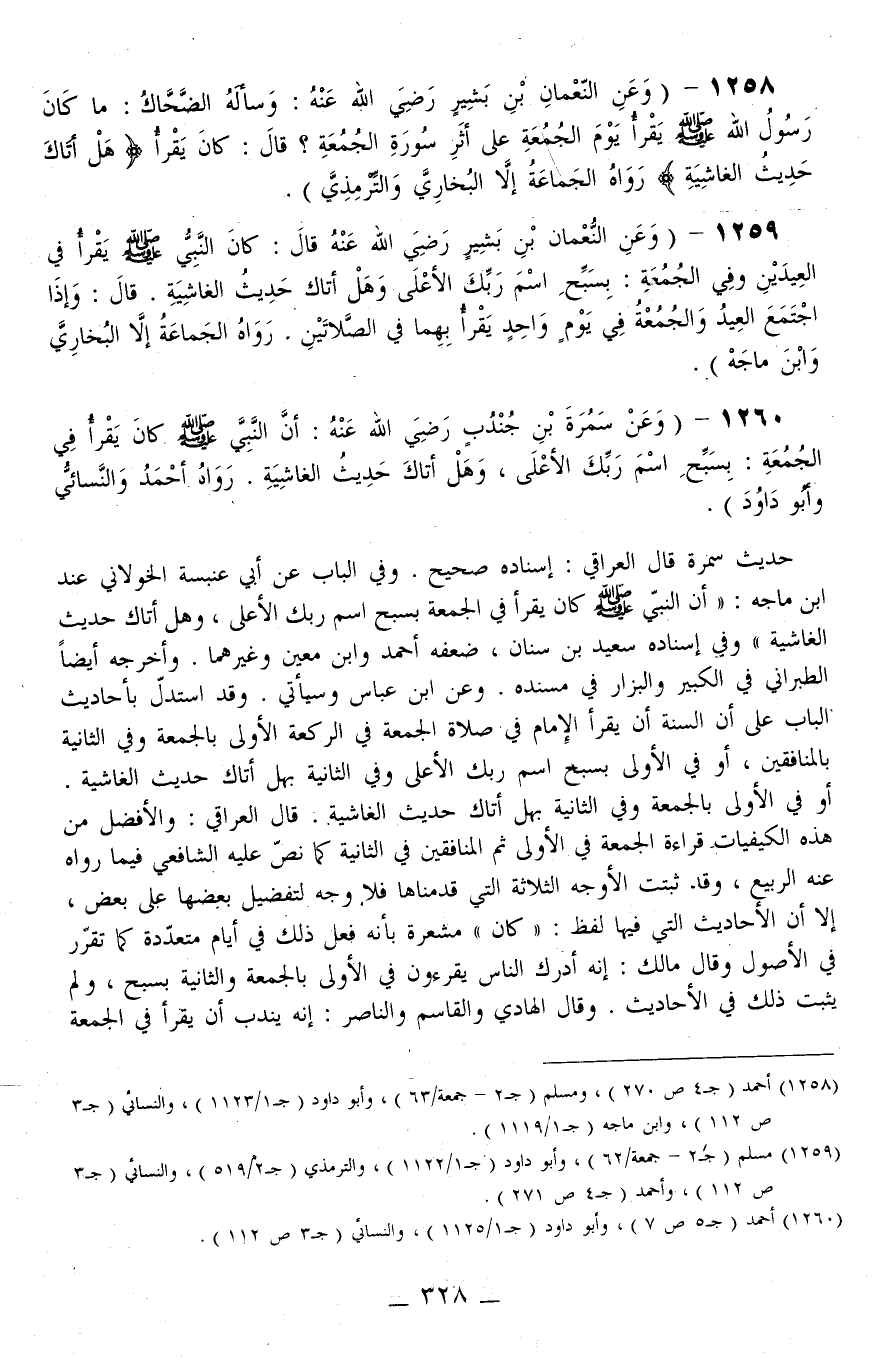 1260 - (وَعَنْ سَمُرَةَ بْنِ جُنْدُبٍ - رَضِيَ اللَّهُ عَنْهُ -: «أَنَّ النَّبِيَّ - صَلَّى اللَّهُ عَلَيْهِ وَسَلَّمَ - كَانَ يَقْرَأُ فِي الْجُمُعَةِ: بِ {سَبِّحِ اسْمَ رَبِّكَ الأَعْلَى} [الأعلى: 1] وَ {هَلْ أَتَاكَ حَدِيثُ الْغَاشِيَةِ} [الغاشية: 1] » رَوَاهُ أَحْمَدُ وَالنَّسَائِيُّ وَأَبُو دَاوُد) . حَدِيثُ سَمُرَةَ قَالَ الْعِرَاقِيُّ: إسْنَادُهُ صَحِيحٌ.
