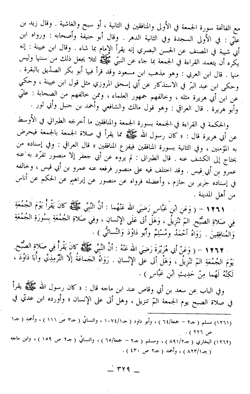 1261 - (وَعَنْ ابْنِ عَبَّاسٍ - رَضِيَ اللَّهُ عَنْهُمَا -: «أَنَّ النَّبِيَّ - صَلَّى اللَّهُ عَلَيْهِ وَسَلَّمَ - كَانَ يَقْرَأُ يَوْمَ الْجُمُعَةِ فِي صَلَاةِ الصُّبْحِ الم تَنْزِيلُ، وَهَلْ أَتَى عَلَى الْإِنْسَانِ، وَفِي صَلَاةِ الْجُمُعَةِ بِسُورَةِ الْجُمُعَةِ وَالْمُنَافِقِينَ» رَوَاهُ أَحْمَدُ وَمُسْلِمٌ وَأَبُو دَاوُد وَالنَّسَائِيُّ) .