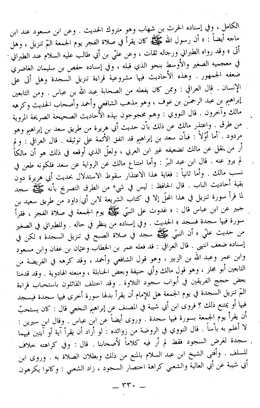 وَعَنْ ابْنِ مَسْعُودٍ عِنْدَ ابْنِ مَاجَهْ أَيْضًا: «أَنَّ رَسُولَ اللَّهِ - صَلَّى اللَّهُ عَلَيْهِ وَسَلَّمَ - كَانَ يَقْرَأُ فِي صَلَاةِ الْفَجْرِ يَوْمَ الْجُمُعَةِ {الم - تَنْزِيلُ} [السجدة: 1 - 2] ، وَهَلْ أَتَى» وَقَدْ رَوَاهُ الطَّبَرَانِيُّ وَرِجَالُهُ ثِقَاتٌ، وَعَنْ عَلِيِّ بْنِ أَبِي طَالِبٍ - عَلَيْهِ السَّلَامُ - عِنْدَ الطَّبَرَانِيِّ فِي مُعْجَمَيْهِ الصَّغِيرِ وَالْأَوْسَطِ بِنَحْوِ الَّذِي قَبْلَهُ، وَفِي إسْنَادِهِ حَفْصُ بْنُ سُلَيْمَانَ الْغَاضِرِيُّ ضَعَّفَهُ الْجُمْهُورُ. وَهَذِهِ الْأَحَادِيثُ فِيهَا مَشْرُوعِيَّةُ قِرَاءَةِ تَنْزِيلِ السَّجْدَةِ وَ {هَلْ أَتَى عَلَى الإِنْسَانِ} [الإنسان: 1] ، قَالَ الْعِرَاقِيُّ: وَمِمَّنْ كَانَ يَفْعَلُهُ مِنْ الصَّحَابَةِ عَبْدُ اللَّهِ بْنُ عَبَّاسٍ. وَمِنْ التَّابِعِينَ إبْرَاهِيمُ بْنُ عَبْدِ الرَّحْمَنِ بْنُ عَوْفٍ، وَهُوَ مَذْهَبُ الشَّافِعِيِّ وَأَحْمَدَ وَأَصْحَابِ الْحَدِيثِ وَكَرِهَهُ مَالِكٌ وَآخَرُونَ. قَالَ النَّوَوِيُّ: وَهُمْ مَحْجُوجُونَ بِهَذِهِ الْأَحَادِيثِ الصَّحِيحَةِ الصَّرِيحَةِ الْمَرْوِيَّةِ مِنْ طُرُقٍ. وَاعْتَذَرَ مَالِكٌ عَنْ ذَلِكَ بِأَنَّ حَدِيثَ أَبِي هُرَيْرَةَ مِنْ طَرِيقِ سَعْدِ بْنِ إبْرَاهِيمَ وَهُوَ مَرْدُودٌ. أَمَّا أَوَّلًا: فَبِأَنَّ سَعْدَ بْنَ إبْرَاهِيمَ قَدْ اتَّفَقَ الْأَئِمَّةُ عَلَى تَوْثِيقِهِ. قَالَ الْعِرَاقِيُّ: وَلَمْ أَرَ مَنْ نَقَلَ عَنْ مَالِكٍ تَضْعِيفَهُ غَيْرَ ابْنِ الْعَرَبِيِّ، وَلَعَلَّ الَّذِي أَوْقَعهُ فِي ذَلِكَ هُوَ أَنَّ مَالِكًا لَمْ يَرْوِ عَنْهُ. قَالَ ابْنُ عَبْدِ الْبَرِّ: وَأَمَّا امْتِنَاعُ مَالِكٍ عَنْ الرِّوَايَةِ عَنْ سَعْدٍ فَلِكَوْنِهِ طَعْنٌ فِي نَسَبِ مَالِكٍ.