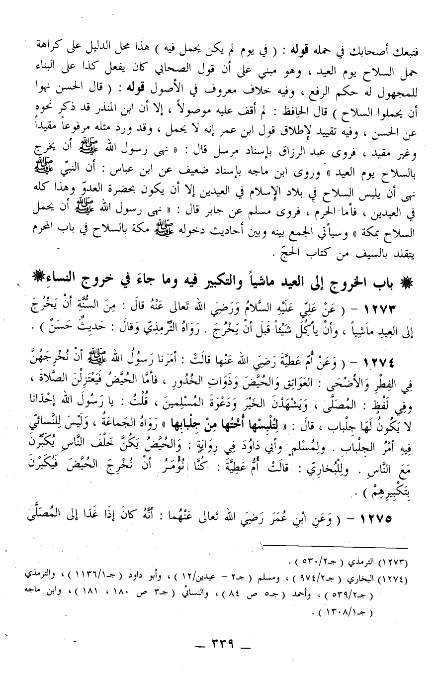 1273 - (عَنْ عَلِيٍّ - عَلَيْهِ السَّلَامُ - وَرَضِيَ اللَّهُ تَعَالَى عَنْهُ قَالَ: «مِنْ السُّنَّةِ أَنْ يَخْرُجَ إلَى الْعِيدِ مَاشِيًا، وَأَنْ يَأْكُلَ شَيْئًا قَبْلَ أَنْ يَخْرُجَ» رَوَاهُ التِّرْمِذِيُّ وَقَالَ: حَدِيثٌ حَسَنٌ)