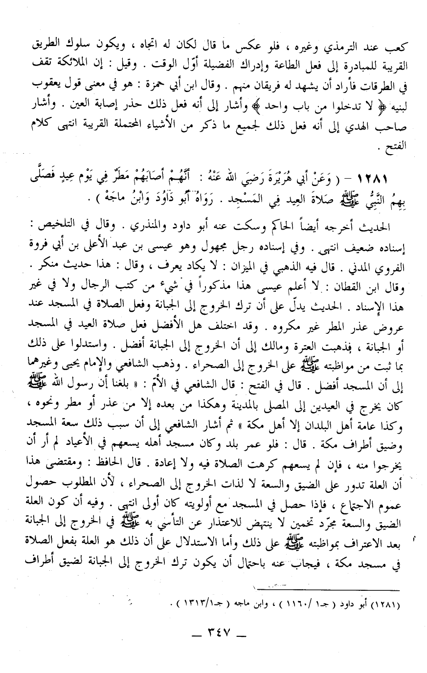1281 - (وَعَنْ أَبِي هُرَيْرَةَ - رَضِيَ اللَّهُ عَنْهُ -: «أَنَّهُمْ أَصَابَهُمْ مَطَرٌ فِي يَوْمِ عِيدٍ فَصَلَّى بِهِمْ النَّبِيُّ - صَلَّى اللَّهُ عَلَيْهِ وَسَلَّمَ - صَلَاةَ الْعِيدِ فِي الْمَسْجِدِ.» رَوَاهُ أَبُو دَاوُد وَابْنُ مَاجَهْ) .