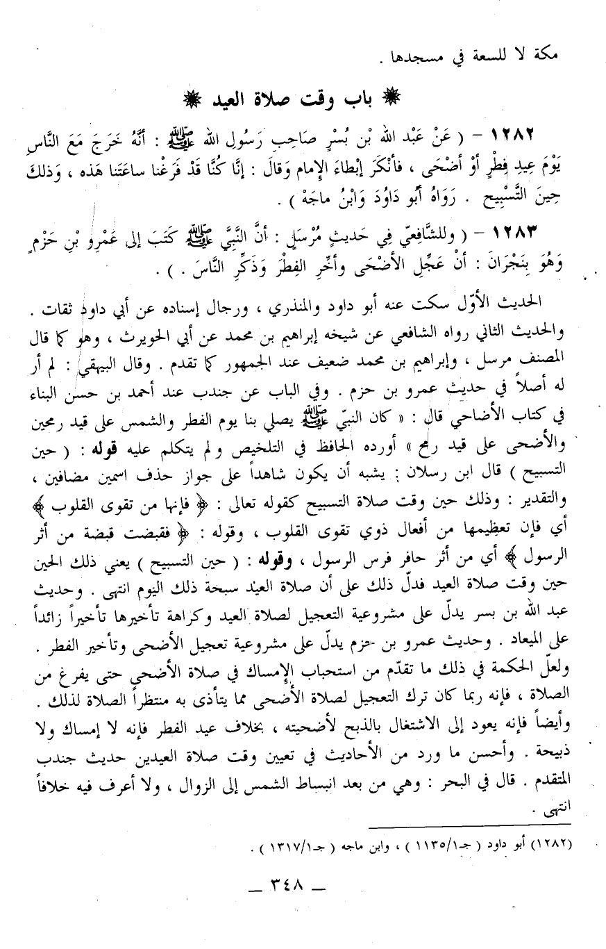 1282 - (عَنْ عَبْدِ اللَّهِ بْنِ بُسْرٍ صَاحِبِ رَسُولِ اللَّهِ - صَلَّى اللَّهُ عَلَيْهِ وَسَلَّمَ -: أَنَّهُ خَرَجَ مَعَ النَّاسِ يَوْمَ عِيدِ فِطْرٍ أَوْ أَضْحَى، فَأَنْكَرَ إبْطَاءَ الْإِمَامِ وَقَالَ: إنَّا كُنَّا قَدْ فَرَغْنَا سَاعَتَنَا هَذِهِ، وَذَلِكَ حِينَ التَّسْبِيحِ رَوَاهُ أَبُو دَاوُد وَابْنُ مَاجَهْ) .