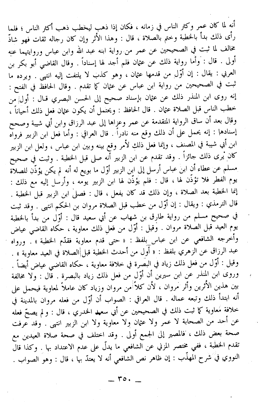 ـــــــــــــــــــــــــــــQأَنَّهُ لَمَّا كَانَ عُمَرُ وَكَثُرَ النَّاسُ فِي زَمَانِهِ، فَكَانَ إذَا ذَهَبَ لِيَخْطُبَ ذَهَبَ أَكْثَرُ النَّاسِ، فَلَمَّا رَأَى ذَلِكَ بَدَأَ بِالْخُطْبَةِ وَخَتَمَ بِالصَّلَاةِ، قَالَ: وَهَذَا الْأَثَرُ وَإِنْ كَانَ رِجَالُهُ ثِقَاتٌ فَهُوَ شَاذٌّ مُخَالِفٌ مَا ثَبَتَ فِي الصَّحِيحَيْنِ عَنْ عُمَرَ مِنْ رِوَايَةِ ابْنِهِ عَبْدِ اللَّهِ وَابْنِ عَبَّاسٍ وَرِوَايَتُهُمَا عَنْهُ أَوْلَى قَالَ: وَأَمَّا رِوَايَةُ ذَلِكَ عَنْ عُثْمَانَ فَلَمْ أَجِدْ لَهَا إسْنَادًا. وَقَالَ الْقَاضِي أَبُو بَكْرِ بْنُ الْعَرَبِيِّ: يُقَالُ: إنَّ أَوَّلَ مَنْ قَدَّمَهَا عُثْمَانُ، وَهُوَ كَذِبٌ لَا يُلْتَفَتُ إلَيْهِ. انْتَهَى. وَيَرُدُّهُ مَا ثَبَتَ فِي الصَّحِيحَيْنِ مِنْ رِوَايَةِ ابْنِ عَبَّاسٍ عَنْ عُثْمَانَ كَمَا تَقَدَّمَ. وَقَالَ الْحَافِظُ فِي الْفَتْحِ: إنَّهُ رَوَى ابْنُ الْمُنْذِرِ ذَلِكَ عَنْ عُثْمَانَ بِإِسْنَادٍ صَحِيحٍ إلَى الْحَسَنِ الْبَصْرِيِّ قَالَ: أَوَّلُ مَنْ خَطَبَ النَّاسَ قَبْلَ الصَّلَاةِ عُثْمَانُ.