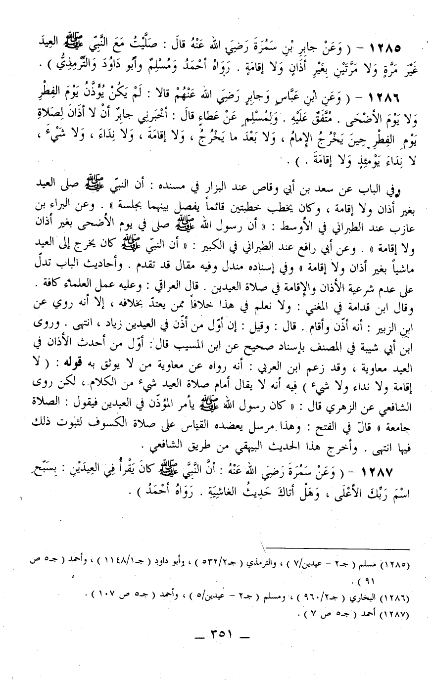 1285 - (وَعَنْ «جَابِرِ بْنِ سَمُرَةَ - رَضِيَ اللَّهُ عَنْهُ - قَالَ: صَلَّيْتُ مَعَ النَّبِيِّ - صَلَّى اللَّهُ عَلَيْهِ وَسَلَّمَ - الْعِيدَ غَيْرَ مَرَّةٍ وَلَا مَرَّتَيْنِ بِغَيْرِ أَذَانٍ وَلَا إقَامَةٍ» رَوَاهُ أَحْمَدُ وَمُسْلِمٌ وَأَبُو دَاوُد وَالتِّرْمِذِيُّ)