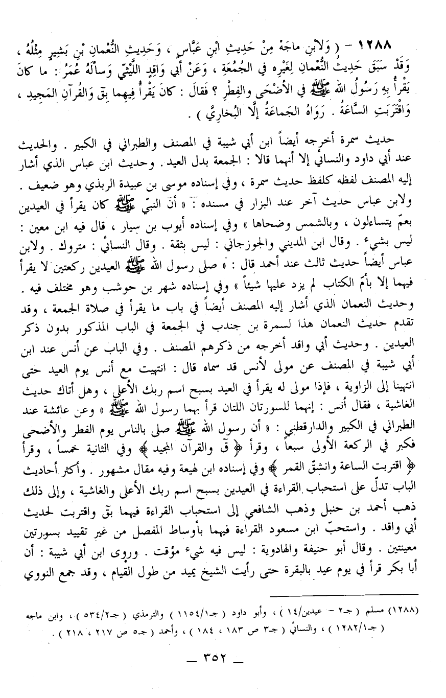 1288 - (وَلِابْنِ مَاجَهْ مِنْ حَدِيثِ ابْنِ عَبَّاسٍ، وَحَدِيثِ النُّعْمَانِ بْنِ بَشِيرٍ مِثْلُهُ، وَقَدْ سَبَقَ حَدِيثُ النُّعْمَانِ لِغَيْرِهِ فِي الْجُمُعَةِ، وَعَنْ «أَبِي وَاقِدٍ اللَّيْثِيِّ وَسَأَلَهُ عُمَرُ: مَا كَانَ يَقْرَأُ بِهِ رَسُولُ اللَّهِ - صَلَّى اللَّهُ عَلَيْهِ وَسَلَّمَ - فِي الْأَضْحَى وَالْفِطْرِ؟ فَقَالَ: كَانَ يَقْرَأُ فِيهِمَا بِ ق وَالْقُرْآنِ الْمَجِيدِ، وَاقْتَرَبَتْ السَّاعَةُ» رَوَاهُ الْجَمَاعَةُ إلَّا الْبُخَارِيَّ) .