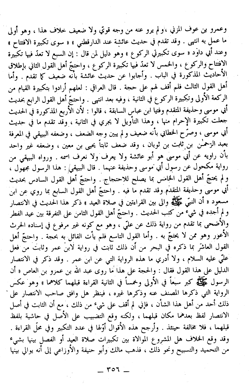 وَاحْتَجَّ أَهْلُ الْقَوْلِ الرَّابِعِ بِحَدِيثِ أَبِي مُوسَى وَحُذَيْفَةَ الْمُتَقَدِّمِ وَفُتْيَا ابْنِ عَبَّاسٍ السَّابِقَةِ، قَالُوا: لِأَنَّ الْأَرْبَعَ الْمَذْكُورَةَ فِي الْحَدِيثِ جُعِلَتْ تَكْبِيرَةَ الْإِحْرَامِ مِنْهَا، وَهَذَا التَّأْوِيلُ لَا يَجْرِي فِي الثَّانِيَةِ، وَقَدْ تَقَدَّمَ مَا فِي حَدِيثِ أَبِي مُوسَى، وَصَرَّحَ الْخَطَّابِيِّ بِأَنَّهُ ضَعِيفٌ وَلَمْ يُبَيِّنْ وَجْهَ الضَّعْفِ، وَضَعَّفَهُ الْبَيْهَقِيُّ فِي الْمَعْرِفَةِ بِعَبْدِ الرَّحْمَنِ بْنِ ثَابِتِ بْنِ ثَوْبَانِ، وَقَدْ ضَعَّفَ ثَابِتًا يَحْيَى بْنُ مَعِينٍ، وَضَعَّفَهُ غَيْرُ وَاحِدٍ بِأَنَّ رَاوِيَهُ عَنْ أَبِي مُوسَى هُوَ أَبُو عَائِشَةَ وَلَا يُعْرَفُ وَلَا نَعْرِفُ اسْمَهُ وَرَوَاهُ الْبَيْهَقِيُّ مِنْ رِوَايَةِ مَكْحُولٍ عَنْ رَسُولِ أَبِي مُوسَى وَحُذَيْفَةَ عَنْهُمَا. قَالَ الْبَيْهَقِيُّ: هَذَا الرَّسُولُ مَجْهُولٌ، وَلَمْ يَحْتَجَّ أَهْلُ الْقَوْلِ الْخَامِسِ بِمَا يَصْلُحُ لِلِاحْتِجَاجِ. وَاحْتَجَّ أَهْلُ الْقَوْلِ السَّادِسِ بِحَدِيثِ أَبِي مُوسَى وَحُذَيْفَةَ الْمُتَقَدِّمِ وَقَدْ تَقَدَّمَ مَا فِيهِ وَاحْتَجَّ أَهْلُ الْقَوْلِ السَّابِعِ بِمَا رُوِيَ عَنْ ابْنِ مَسْعُودٍ «أَنَّ النَّبِيَّ - صَلَّى اللَّهُ عَلَيْهِ وَسَلَّمَ - وَالَى بَيْن الْقِرَاءَتَيْنِ فِي صَلَاةِ الْعِيدِ» ذَكَرَ هَذَا الْحَدِيثَ فِي الِانْتِصَارِ وَلَمْ أَجِدْهُ فِي شَيْءٍ مِنْ كُتَبِ الْحَدِيثِ.