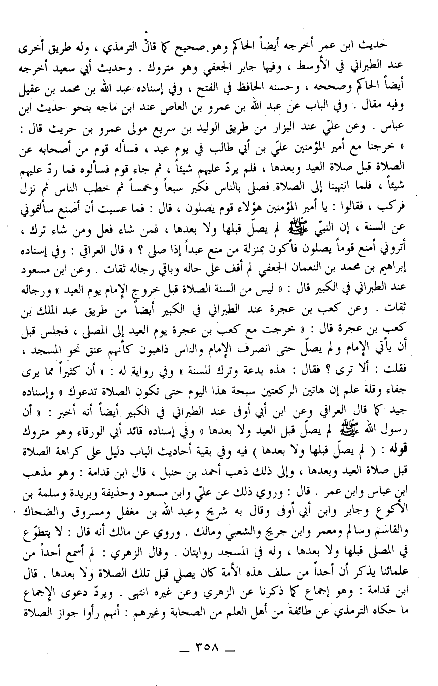 قَالَ الْعِرَاقِيُّ: وَفِي إسْنَادِهِ إبْرَاهِيمُ بْنُ مُحَمَّدِ بْنِ النُّعْمَانِ الْجُعْفِيُّ لَمْ أَقِفْ عَلَى حَالِهِ وَبَاقِي رِجَالُهُ ثِقَاتٌ، وَعَنْ ابْنِ مَسْعُودٍ عِنْدَ الطَّبَرَانِيِّ فِي الْكَبِيرِ قَالَ: «لَيْسَ مِنْ السُّنَّةِ الصَّلَاةُ قَبْلَ خُرُوجِ الْإِمَامِ يَوْمَ الْعِيدِ» وَرِجَالُهُ ثِقَاتٌ.
