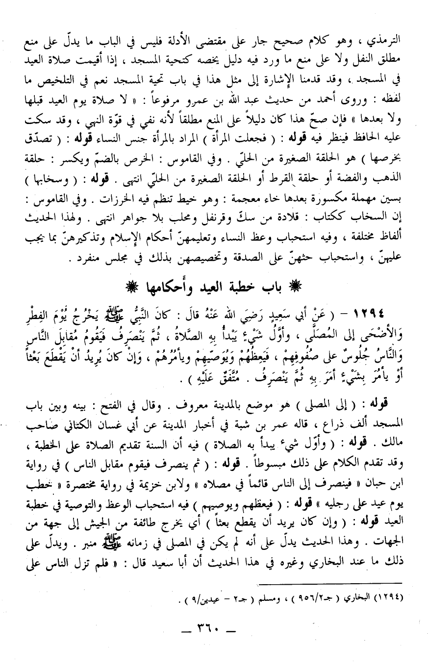 1294 - (عَنْ أَبِي سَعِيدٍ - رَضِيَ اللَّهُ عَنْهُ - قَالَ: «كَانَ النَّبِيُّ - صَلَّى اللَّهُ عَلَيْهِ وَسَلَّمَ - يَخْرُجُ يَوْمَ الْفِطْرِ وَالْأَضْحَى إلَى الْمُصَلَّى، وَأَوَّلُ شَيْءٍ يَبْدَأُ بِهِ الصَّلَاةُ، ثُمَّ يَنْصَرِفُ فَيَقُومُ مُقَابِلَ النَّاسِ وَالنَّاسُ جُلُوسٌ عَلَى صُفُوفِهِمْ، فَيَعِظهُمْ وَيُوصِيهِمْ وَيَأْمُرُهُمْ، وَإِنْ كَانَ يُرِيدُ أَنْ يَقْطَعَ بَعْثًا أَوْ يَأْمُرَ بِشَيْءٍ أَمَرَ بِهِ ثُمَّ يَنْصَرِفُ» مُتَّفَقٌ عَلَيْهِ) .