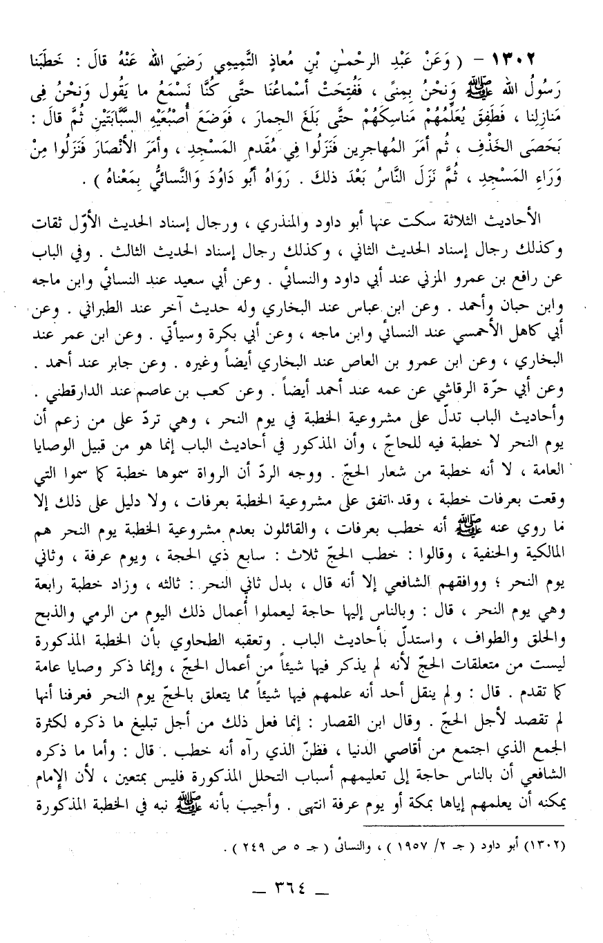 1302 - (وَعَنْ عَبْدِ الرَّحْمَنِ بْنِ مُعَاذٍ التَّيْمِيِّ - رَضِيَ اللَّهُ عَنْهُ - قَالَ: «خَطَبَنَا رَسُولُ اللَّهِ - صَلَّى اللَّهُ عَلَيْهِ وَسَلَّمَ - وَنَحْنُ بِمِنًى، فَفُتِحَتْ أَسْمَاعُنَا حَتَّى كُنَّا نَسْمَعُ مَا يَقُولُ وَنَحْنُ فِي مَنَازِلِنَا، فَطَفِقَ يُعَلِّمَهُمْ مَنَاسِكَهُمْ حَتَّى بَلَغَ الْجِمَارَ، فَوَضَعَ أُصْبُعَيْهِ السَّبَّابَتَيْنِ ثُمَّ قَالَ: بِحَصَى الْخَذْفِ، ثُمَّ أَمَرَ الْمُهَاجِرِينَ فَنَزَلُوا فِي مُقَدَّمِ الْمَسْجِدَ، وَأَمَرَ الْأَنْصَارَ فَنَزَلُوا مِنْ وَرَاءِ الْمَسْجِدِ، ثُمَّ نَزَلَ النَّاسُ بَعْد ذَلِكَ» رَوَاهُ أَبُو دَاوُد وَالنَّسَائِيُّ بِمَعْنَاهُ) .