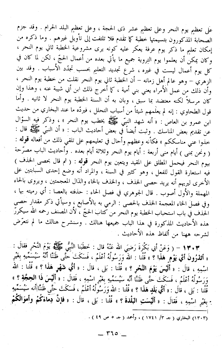 1303 - (وَعَنْ أَبِي بَكْرَةَ - رَضِيَ اللَّهُ عَنْهُ - قَالَ: «خَطَبَنَا النَّبِيُّ - صَلَّى اللَّهُ عَلَيْهِ وَسَلَّمَ - يَوْمَ النَّحْرِ فَقَالَ: أَتَدْرُونَ أَيَّ يَوْمٍ هَذَا؟ قُلْنَا: اللَّهُ وَرَسُولُهُ أَعْلَمُ، فَسَكَتَ حَتَّى ظَنَنَّا أَنَّهُ سَيُسَمِّيهِ بِغَيْرِ اسْمِهِ، قَالَ: أَلَيْسَ يَوْمَ النَّحْرِ؟ قُلْنَا: بَلَى، قَالَ: أَيُّ شَهْرٍ هَذَا؟ قُلْنَا: اللَّهُ وَرَسُولُهُ أَعْلَمُ، فَسَكَتَ حَتَّى ظَنَنَّا أَنَّهُ سَيُسَمِّيهِ بِغَيْرِ اسْمِهِ، فَقَالَ: أَلَيْسَ ذَا الْحِجَّةِ؟ قُلْنَا: بَلَى، قَالَ: أَيُّ بَلَدٍ هَذَا؟ قُلْنَا: اللَّهُ وَرَسُولُهُ أَعْلَمُ، فَسَكَتَ حَتَّى ظَنَنَّا أَنَّهُ سَيُسَمِّيهِ بِغَيْرِ اسْمِهِ، فَقَالَ: أَلَيْسَتْ الْبَلْدَةُ؟ قُلْنَا: بَلَى، قَالَ: فَإِنَّ دِمَاءَكُمْ وَأَمْوَالَكُمْ