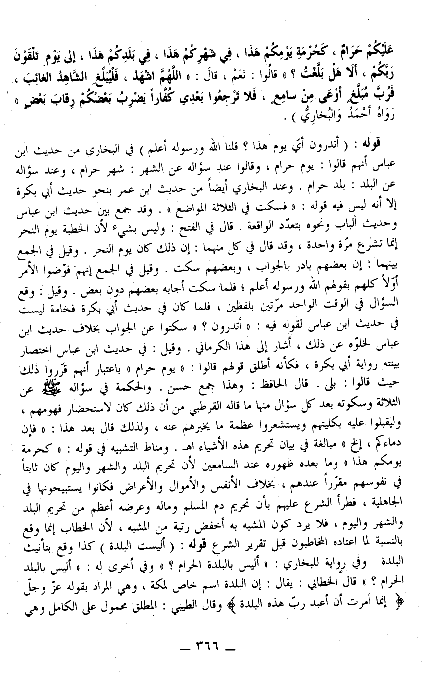 عَلَيْكُمْ حَرَامٌ، كَحُرْمَةِ يَوْمِكُمْ هَذَا، فِي شَهْرِكُمْ هَذَا، فِي بَلَدِكُمْ هَذَا، إلَى يَوْمِ تَلْقَوْنَ رَبّكُمْ، أَلَا هَلْ بَلَّغْتُ؟ قَالُوا: نَعَمْ، قَالَ: اللَّهُمَّ اشْهَدْ، فَلْيُبَلِّغْ الشَّاهِدُ الْغَائِبَ، فَرُبَّ مُبَلَّغٍ أَوْعَى مِنْ سَامِعٍ، فَلَا تَرْجِعُوا بَعْدِي كُفَّارًا يَضْرِبُ بَعْضُكُمْ رِقَابَ بَعْضٍ» رَوَاهُ أَحْمَدُ وَالْبُخَارِيُّ) .