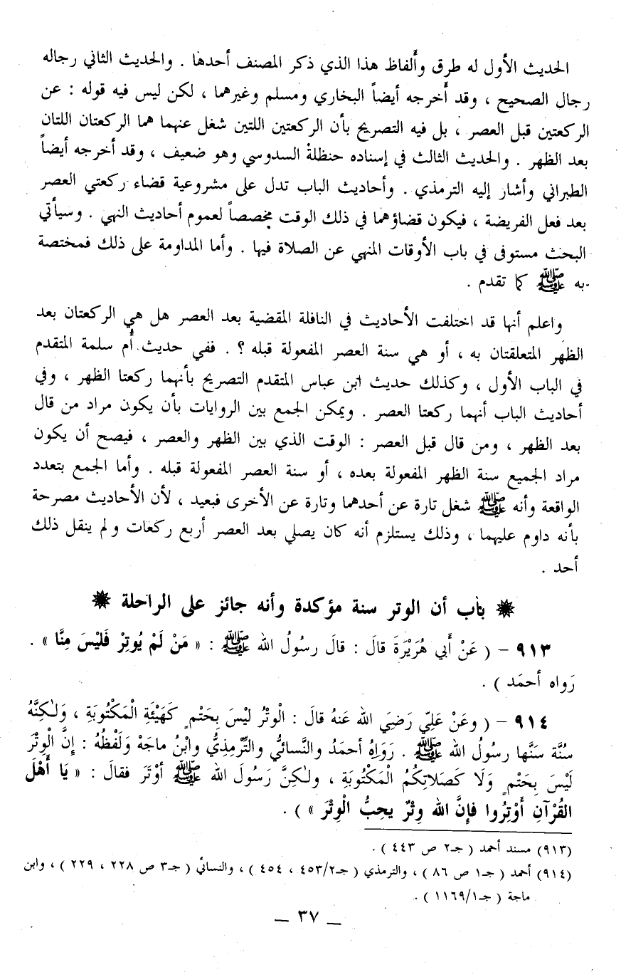 914 - (وَعَنْ عَلِيٍّ - رَضِيَ اللَّهُ عَنْهُ - قَالَ: «الْوِتْرُ لَيْسَ بِحَتْمٍ كَهَيْئَةِ الْمَكْتُوبَةِ، وَلَكِنَّهُ سُنَّةٌ سَنَّهَا رَسُولُ اللَّهِ - صَلَّى اللَّهُ عَلَيْهِ وَسَلَّمَ -. رَوَاهُ أَحْمَدُ وَالنَّسَائِيُّ وَالتِّرْمِذِيُّ وَابْنُ مَاجَهْ وَلَفْظُهُ: إنَّ الْوِتْرَ لَيْسَ بِحَتْمٍ، وَلَا كَصَلَاتِكُمْ الْمَكْتُوبَةِ، وَلَكِنَّ رَسُولَ اللَّهِ - صَلَّى اللَّهُ عَلَيْهِ وَسَلَّمَ - أَوْتَرَ فَقَالَ: يَا أَهْلَ الْقُرْآنِ أَوْتِرُوا فَإِنَّ اللَّهَ وِتْرٌ يُحِبُّ الْوِتْرَ) » .