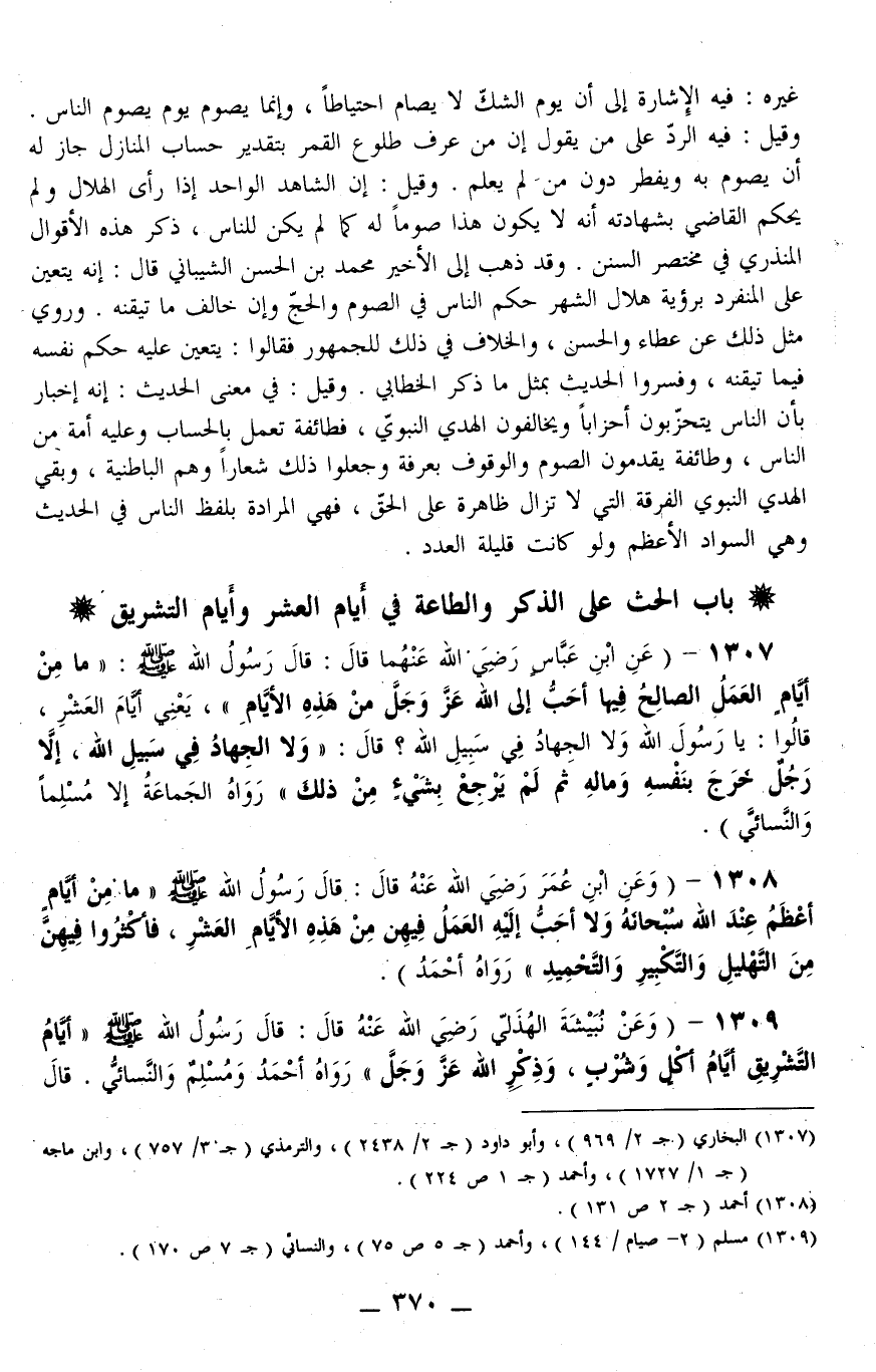 1307 - (عَنْ ابْنِ عَبَّاسٍ - رَضِيَ اللَّهُ عَنْهُمَا - قَالَ: قَالَ رَسُولُ اللَّهِ - صَلَّى اللَّهُ عَلَيْهِ وَسَلَّمَ -: «مَا مِنْ أَيَّامٍ الْعَمَلُ الصَّالِحُ فِيهَا أَحَبَّ إلَى اللَّهِ عَزَّ وَجَلَّ مِنْ هَذِهِ الْأَيَّامِ، يَعْنِي أَيَّامَ الْعَشْرِ، قَالُوا: يَا رَسُولَ اللَّهِ وَلَا الْجِهَادُ فِي سَبِيلِ اللَّهِ؟ قَالَ: وَلَا الْجِهَادُ فِي سَبِيلِ اللَّهِ، إلَّا رَجُلٌ خَرَجَ بِنَفْسِهِ وَمَالِهِ ثُمَّ لَمْ يَرْجِعْ بِشَيْءٍ مِنْ ذَلِكَ» رَوَاهُ الْجَمَاعَةُ إلَّا مُسْلِمًا وَالنَّسَائِيُّ)