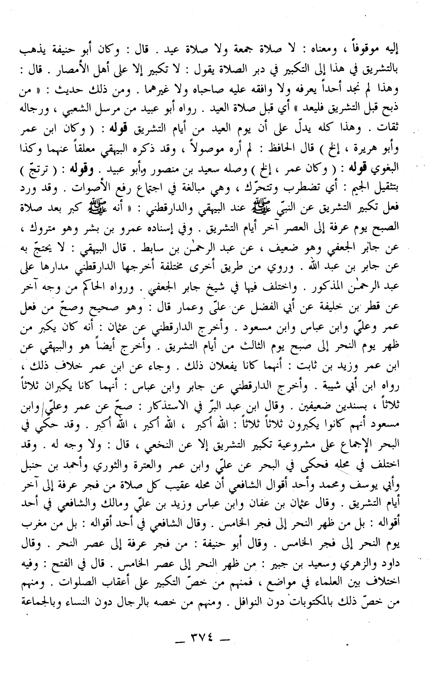 قَالَ: وَكَانَ أَبُو حَنِيفَةَ يَذْهَبُ بِالتَّشْرِيقِ فِي هَذَا إلَى التَّكْبِير فِي دُبُرِ الصَّلَاةِ يَقُولُ: لَا تَكْبِيرَ إلَّا عَلَى أَهْلِ الْأَمْصَارِ. قَالَ: وَهَذَا لَمْ تَجِدْ أَحَدًا يَعْرِفُهُ، وَلَا وَافَقَهُ عَلَيْهِ صَاحِبَاهُ وَلَا غَيْرُهُمَا. وَمِنْ ذَلِكَ حَدِيثُ: «مَنْ ذَبَحَ قَبْلَ التَّشْرِيقِ فَلْيُعِدْ» أَيْ قَبْلَ صَلَاةَ الْعِيدِ. رَوَاهُ أَبُو عُبَيْدٍ مِنْ مُرْسَلِ الشَّعْبِيِّ، وَرِجَالُهُ ثِقَاتٌ. وَهَذَا كُلُّهُ يَدُلُّ عَلَى أَنَّ يَوْمَ الْعِيدِ مِنْ أَيَّامِ التَّشْرِيقِ.
