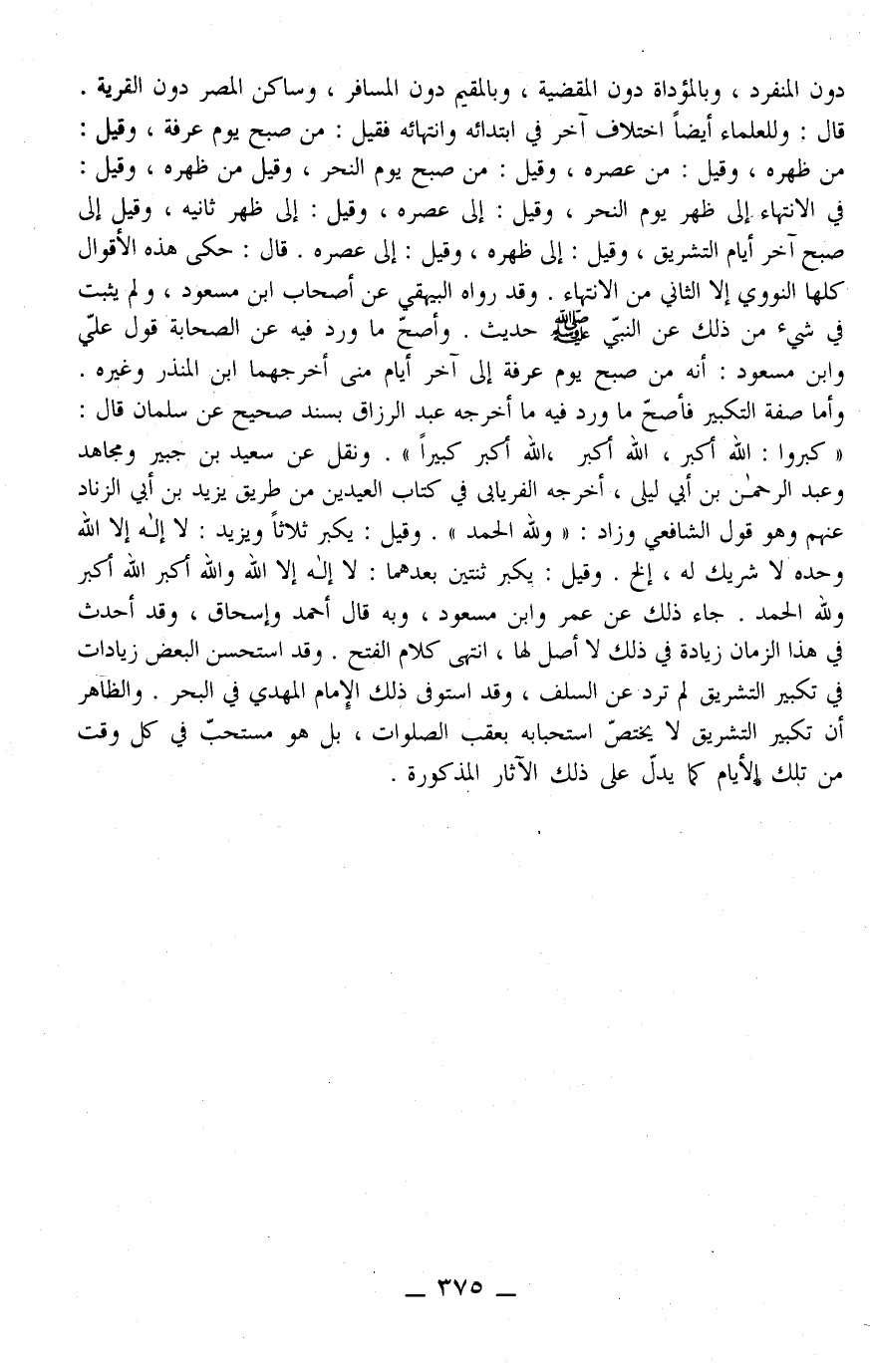 ـــــــــــــــــــــــــــــQدُونَ الْمُنْفَرِدِ، وَبِالْمُؤَدَّاةِ دُون الْمَقْضِيَّةِ، وَبِالْمُقِيمِ دُونَ الْمُسَافِرِ، وَسَاكِنِ الْمِصْرِ دُونَ الْقَرْيَةِ. قَالَ: وَلِلْعُلَمَاءِ أَيْضًا اخْتِلَافٌ آخِرُ فِي ابْتِدَائِهِ وَانْتِهَائِهِ فَقِيلَ: مِنْ صُبْحِ يَوْمِ عَرَفَةَ، وَقِيلَ: مِنْ ظُهْرِهِ، وَقِيلَ: مِنْ عَصْرِهِ، وَقِيلَ: مِنْ صُبْحِ يَوْمِ النَّحْرِ، وَقِيلَ مِنْ ظُهْرِهِ، وَقِيلَ: فِي الِانْتِهَاءِ إلَى ظُهْرِ يَوْمِ النَّحْرِ، وَقِيلَ: إلَى عَصْرِهِ، وَقِيلَ: إلَى ظُهْرِ ثَانِيهِ، وَقِيلَ إلَى صُبْحِ آخِرِ أَيَّامِ التَّشْرِيقِ، وَقِيلَ: إلَى ظُهْرِهِ، وَقِيلَ: إلَى عَصْرِهِ. قَالَ: حَكَى هَذِهِ الْأَقْوَالَ كُلَّهَا النَّوَوِيُّ إلَّا الثَّانِيَ مِنْ الِانْتِهَاءِ.