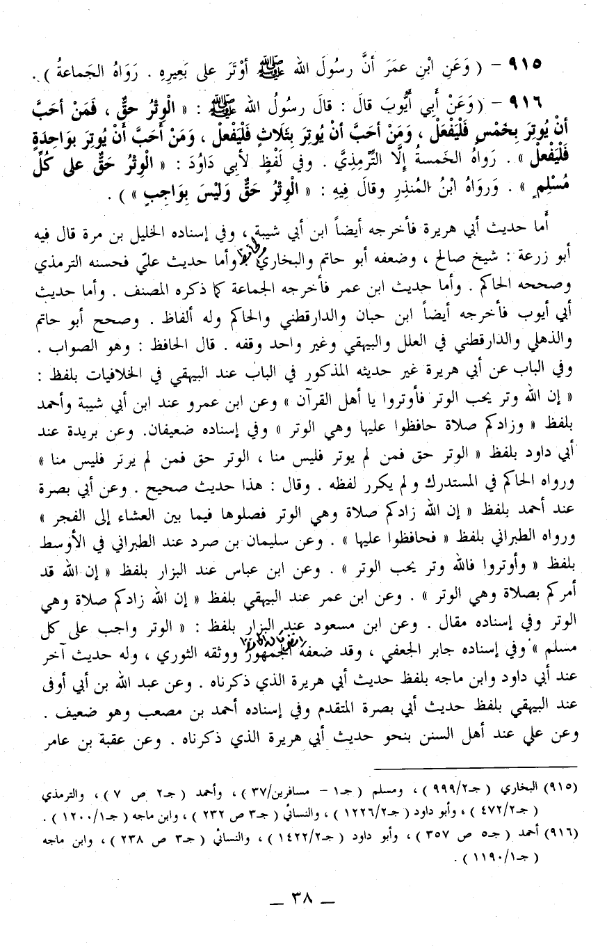 916 - (وَعَنْ أَبِي أَيُّوبَ قَالَ: قَالَ رَسُولُ اللَّه - صَلَّى اللَّهُ عَلَيْهِ وَسَلَّمَ - «الْوِتْرُ حَقٌّ، فَمَنْ أَحَبَّ أَنْ يُوتِرَ بِخَمْسٍ فَلْيَفْعَلْ، وَمَنْ أَحَبَّ أَنْ يُوتِرَ بِثَلَاثٍ فَلْيَفْعَلْ، وَمَنْ أَحَبَّ أَنْ يُوتِرَ بِوَاحِدَةٍ فَلْيَفْعَلْ» . رَوَاهُ الْخَمْسَةُ إلَّا التِّرْمِذِيَّ.
