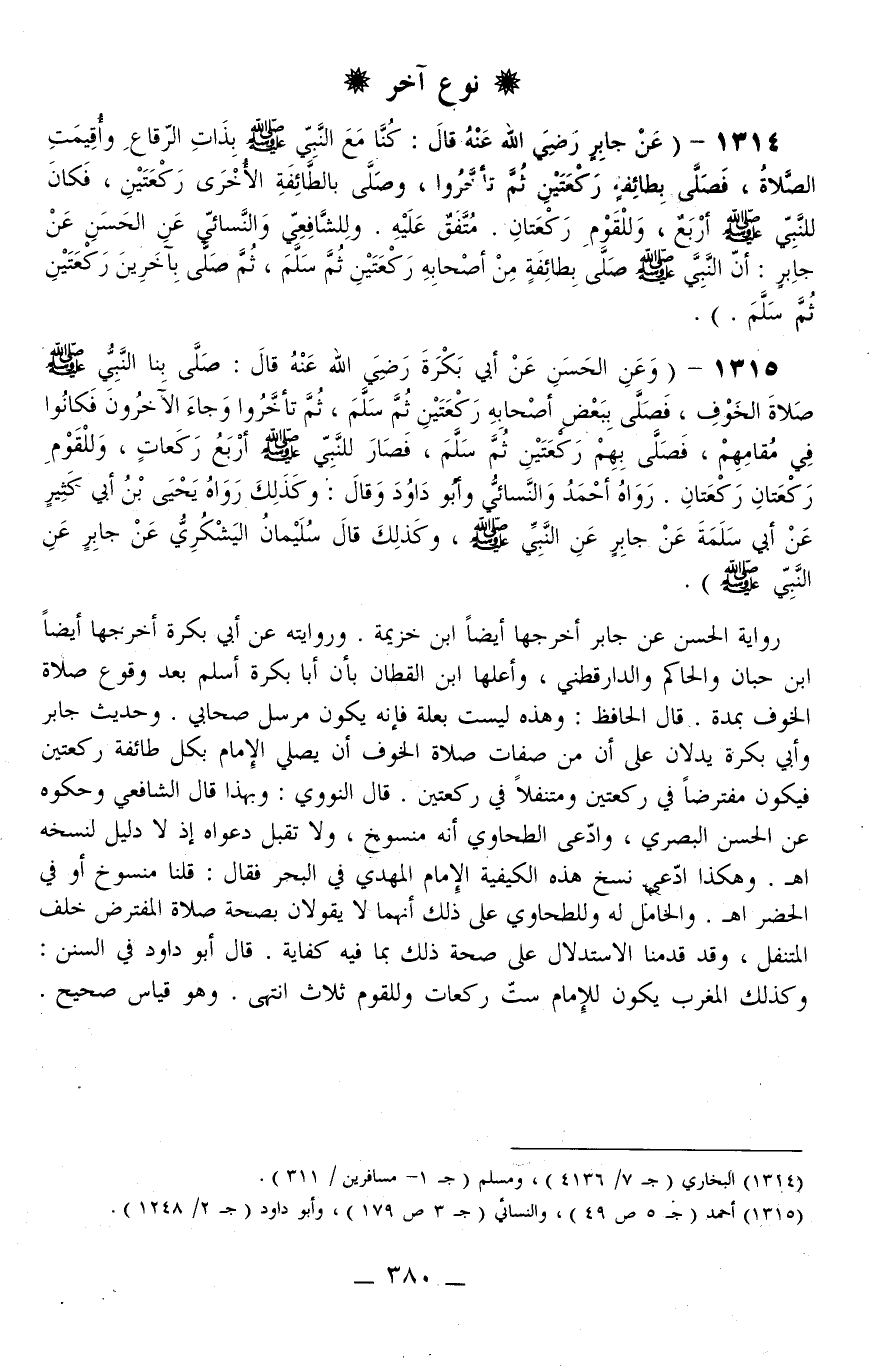 ـــــــــــــــــــــــــــــQرِوَايَةُ الْحَسَنِ عَنْ جَابِرٍ أَخْرَجَهَا أَيْضًا ابْنُ خُزَيْمَةَ. وَرِوَايَتُهُ عَنْ أَبِي بَكْرَةَ أَخْرَجَهَا أَيْضًا ابْنُ حِبَّانَ وَالْحَاكِمُ وَالدَّارَقُطْنِيّ، وَأَعَلَّهَا ابْنُ الْقَطَّانِ بِأَنَّ أَبَا بَكْرَةَ أَسْلَمَ بَعْدَ وُقُوعِ صَلَاةِ الْخَوْفِ بِمُدَّةٍ. قَالَ الْحَافِظُ: وَهَذِهِ لَيْسَتْ بِعِلَّةٍ فَإِنَّهُ يَكُون مُرْسَلٌ صَحَابِيٍّ وَحَدِيثُ جَابِرٍ وَأَبِي بَكْرَةَ يَدُلَّانِ عَلَى أَنَّ مِنْ صِفَاتِ صَلَاةِ الْخَوْفِ أَنْ يُصَلِّيَ الْإِمَامُ بِكُلِّ طَائِفَةٍ رَكْعَتَيْنِ فَيَكُونُ مُفْتَرِضًا فِي رَكْعَتَيْنِ وَمُتَنَفِّلًا فِي رَكْعَتَيْنِ. قَالَ النَّوَوِيُّ: وَبِهَذَا قَالَ الشَّافِعِيُّ وَحَكُوهُ عَنْ الْحَسَنِ الْبَصْرِيِّ، وَادَّعَى الطَّحَاوِيُّ أَنَّهُ مَنْسُوخٌ، وَلَا تُقْبَلُ دَعْوَاهُ إذْ لَا دَلِيلَ لِنَسْخِهِ. اهـ.