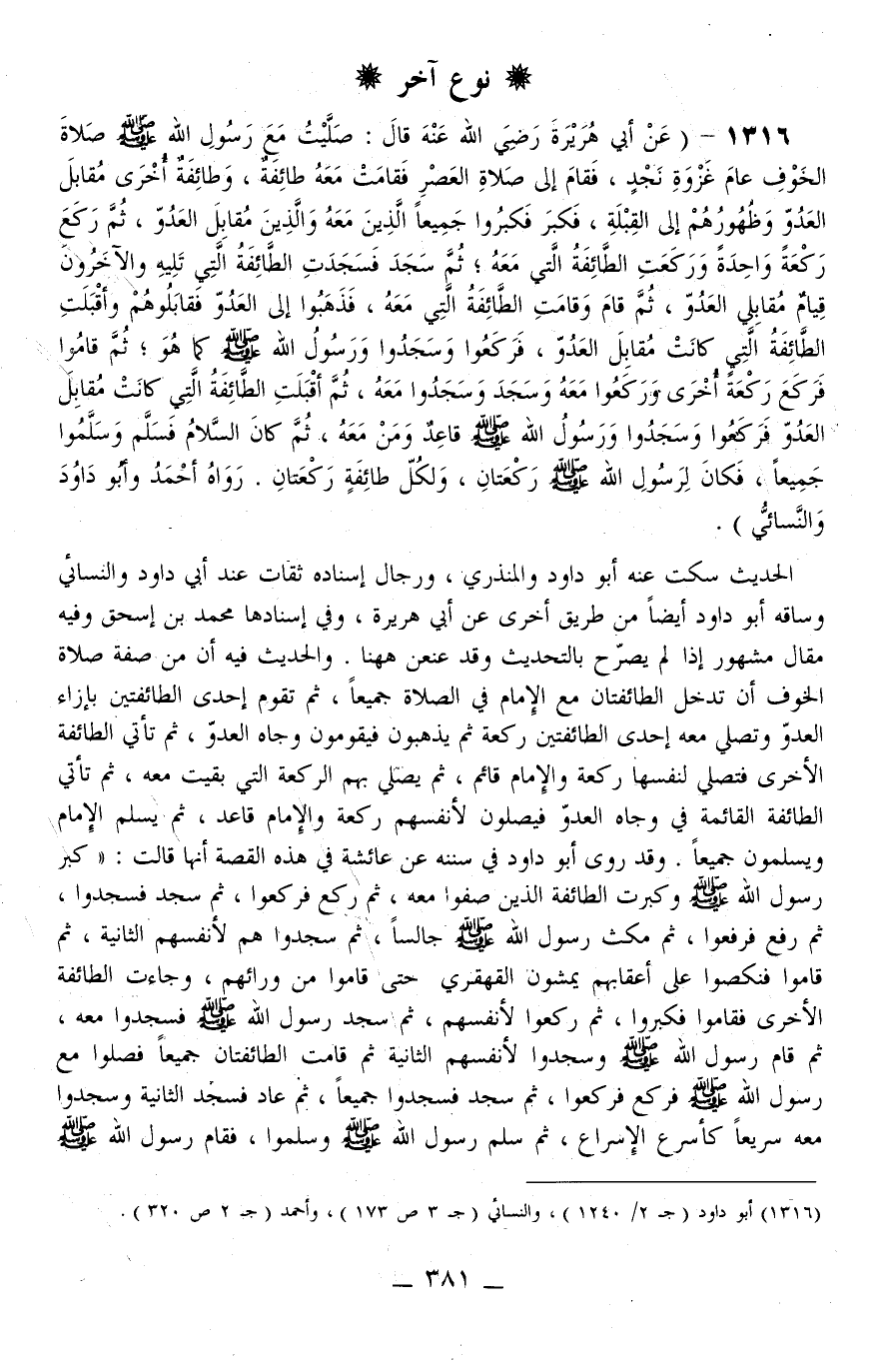 نَوْع آخَرَ - 1316 (عَنْ أَبِي هُرَيْرَةَ - رَضِيَ اللَّهُ عَنْهُ - قَالَ: «صَلَّيْتُ مَعَ رَسُولِ اللَّهِ - صَلَّى اللَّهُ عَلَيْهِ وَسَلَّمَ - صَلَاةَ الْخَوْفِ عَامَ غَزْوَةِ نَجْدٍ، فَقَامَ إلَى صَلَاةِ الْعَصْرِ فَقَامَتْ مَعَهُ طَائِفَةٌ، وَطَائِفَةٌ أُخْرَى مُقَابِلَ الْعَدُوِّ وَظُهُورُهُمْ إلَى الْقِبْلَةِ، فَكَبَّرَ فَكَبَّرُوا جَمِيعًا الَّذِينَ مَعَهُ وَاَلَّذِينَ مُقَابِلَ الْعَدُوِّ، ثُمَّ رَكَعَ رَكْعَةً وَاحِدَةً وَرَكَعَتْ الطَّائِفَةُ الَّتِي مَعَهُ، ثُمَّ سَجَدَ فَسَجَدَتْ الطَّائِفَةُ الَّتِي تَلِيهِ وَالْآخَرُونَ قِيَامٌ مُقَابِلِي الْعَدُوِّ، ثُمَّ قَامَ وَقَامَتْ الطَّائِفَةُ الَّتِي مَعَهُ، فَذَهَبُوا إلَى الْعَدُوِّ فَقَابَلُوهُمْ وَأَقْبَلَتْ الطَّائِفَةُ الَّتِي كَانَتْ مُقَابِلَ الْعَدُوِّ، فَرَكَعُوا وَسَجَدُوا وَرَسُولُ اللَّهِ - صَلَّى اللَّهُ عَلَيْهِ وَسَلَّمَ - كَمَا هُوَ، ثُمَّ قَامُوا فَرَكَعَ رَكْعَةً أُخْرَى وَرَكَعُوا مَعَهُ وَسَجَدَ وَسَجَدُوا مَعَهُ، ثُمَّ أَقْبَلَتْ الطَّائِفَةُ الَّتِي كَانَتْ مُقَابِلَ الْعَدُوِّ فَرَكَعُوا وَسَجَدُوا وَرَسُولُ اللَّهِ - صَلَّى اللَّهُ عَلَيْهِ وَسَلَّمَ - قَاعِدٌ وَمَنْ مَعَهُ، ثُمَّ كَانَ السَّلَامُ فَسَلَّمَ وَسَلَّمُوا جَمِيعًا، فَكَانَ لِرَسُولِ اللَّهِ - صَلَّى اللَّهُ عَلَيْهِ وَسَلَّمَ - رَكْعَتَانِ، وَلِكُلِّ طَائِفَةٍ رَكْعَتَانِ.» رَوَاهُ أَحْمَدُ وَأَبُو دَاوُد وَالنَّسَائِيُّ) .