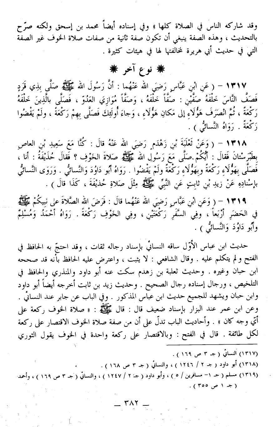 1317 - (عَنْ ابْنِ عَبَّاسٍ - رَضِيَ اللَّهُ عَنْهُمَا -: «أَنَّ رَسُولَ اللَّهِ - صَلَّى اللَّهُ عَلَيْهِ وَسَلَّمَ - صَلَّى بِذِي قَرَدٍ فَصَفَّ النَّاسَ خَلْفَهُ صَفَّيْنِ: صَفًا خَلْفَهُ، وَصَفًّا مُوَازِيَ الْعَدُوِّ، فَصَلَّى بِاَلَّذِينَ خَلْفَهُ رَكْعَةً، ثُمَّ انْصَرَفَ هَؤُلَاءِ إلَى مَكَانِ هَؤُلَاءِ، وَجَاءَ أُولَئِكَ فَصَلَّى بِهِمْ رَكْعَةً، وَلَمْ يَقْضُوا رَكْعَةً.» رَوَاهُ النَّسَائِيّ) .
