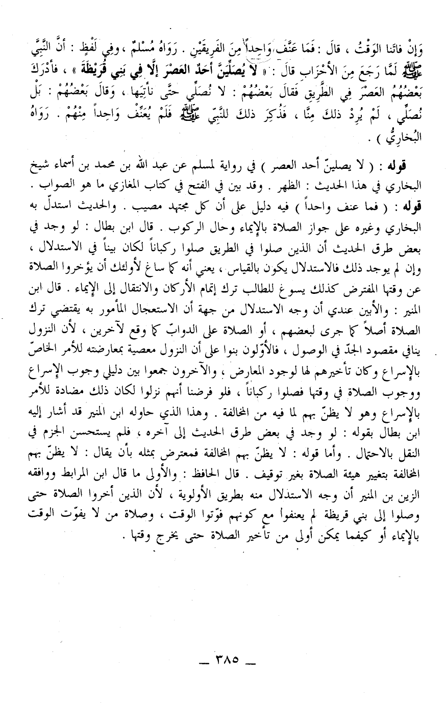 قَوْلُهُ: «لَا يُصَلِّيَنَّ أَحَدٌ الْعَصْرَ» فِي رِوَايَةٍ لِمُسْلِمٍ عَنْ عَبْدِ اللَّهِ بْنِ مُحَمَّدِ بْنِ أَسْمَاءَ شَيْخُ الْبُخَارِيِّ فِي هَذَا الْحَدِيثِ: الظُّهْرَ. وَقَدْ بَيَّنَ فِي الْفَتْحِ فِي كِتَابِ الْمَغَازِي مَا هُوَ الصَّوَابُ. قَوْلُهُ: (فَمَا عَنَّفَ وَاحِدًا) فِيهِ دَلِيلٌ عَلَى أَنَّ كُلَّ مُجْتَهِدٍ مُصِيبٌ. وَالْحَدِيثُ اسْتَدَلَّ بِهِ الْبُخَارِيُّ وَغَيْرُهُ عَلَى جَوَازِ الصَّلَاةِ بِالْإِيمَاءِ وَحَالَ الرُّكُوبِ.