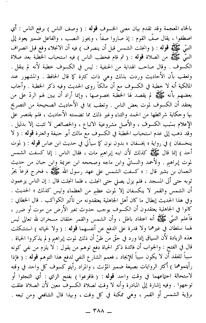 ـــــــــــــــــــــــــــــQبِالْخَاءِ الْمُعْجَمَةِ وَقَدْ تَقَدَّمَ بَيَانُ مَعْنَى الْخُسُوفِ قَوْلُهُ: (وَصَفَّ النَّاسُ) بِرَفْعِ (النَّاسُ) : أَيْ اصْطَفُّوا، يُقَال صَفَّ الْقَوْمُ: إذْ صَارُوا صَفَّا، وَيَجُوزُ النَّصْبُ، وَالْفَاعِلُ ضَمِيرٌ يَعُودُ إلَى النَّبِيِّ - صَلَّى اللَّهُ عَلَيْهِ وَسَلَّمَ - قَوْلُهُ: (وَانْجَلَتْ الشَّمْسُ قَبْلَ أَنْ يَنْصَرِفَ) فِيهِ أَنَّ الِانْجِلَاءَ وَقَعَ قَبْلَ انْصِرَافِ النَّبِيِّ - صَلَّى اللَّهُ عَلَيْهِ وَسَلَّمَ - مِنْ الصَّلَاةِ قَوْلُهُ: (ثُمَّ قَامَ فَخَطَبَ النَّاسَ) فِيهِ اسْتِحْبَابُ الْخُطْبَةِ بَعْدَ صَلَاةِ الْكُسُوفِ.
