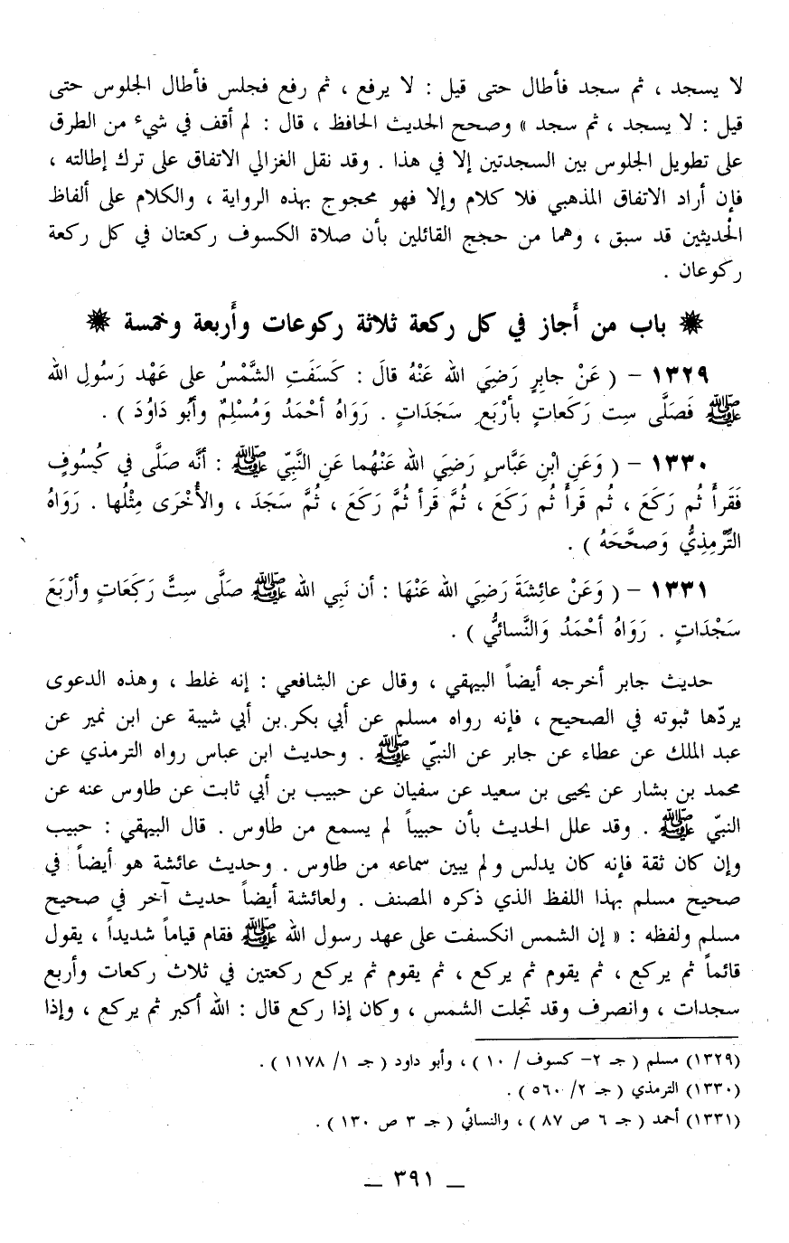 1329 - (عَنْ جَابِرٍ - رَضِيَ اللَّهُ عَنْهُ - قَالَ: «كَسَفَتْ الشَّمْسُ عَلَى عَهْدِ رَسُولِ اللَّهِ - صَلَّى اللَّهُ عَلَيْهِ وَسَلَّمَ - فَصَلَّى سِتَّ رَكَعَاتٍ بِأَرْبَعِ سَجَدَاتٍ» رَوَاهُ أَحْمَدُ وَمُسْلِمٌ وَأَبُو دَاوُد) .