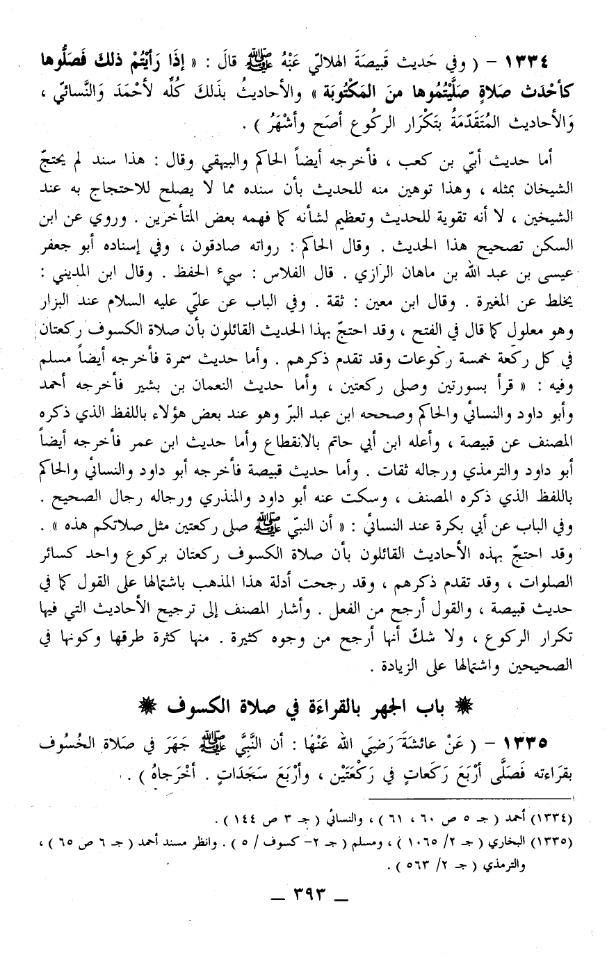 1334 - (وَفِي حَدِيثِ قَبِيصَةَ الْهِلَالِيِّ عَنْهُ - صَلَّى اللَّهُ عَلَيْهِ وَسَلَّمَ - قَالَ: «إذَا رَأَيْتُمْ ذَلِكَ فَصَلُّوهَا كَأَحْدَثِ صَلَاةٍ صَلَّيْتُمُوهَا مِنْ الْمَكْتُوبَةِ» وَالْأَحَادِيثُ بِذَلِكَ كُلِّهِ لِأَحْمَدَ وَالنَّسَائِيُّ، وَالْأَحَادِيثُ الْمُتَقَدِّمَةُ بِتَكْرَارِ الرُّكُوعِ أَصَحُّ وَأَشْهَرُ) .