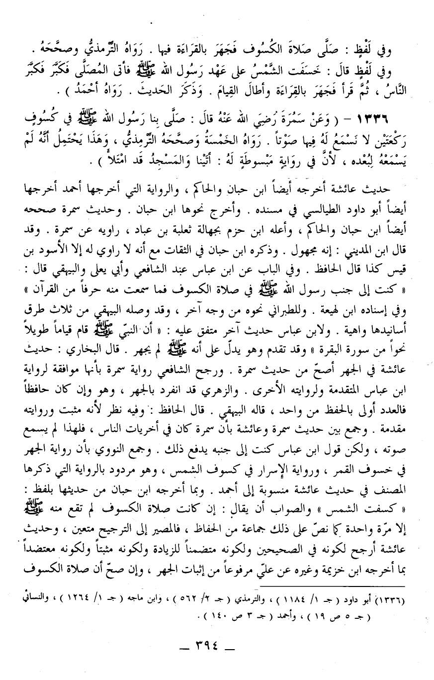 1336 - (وَعَنْ سَمُرَةَ - رَضِيَ اللَّهُ عَنْهُ - قَالَ: «صَلَّى بِنَا رَسُولُ اللَّهِ - صَلَّى اللَّهُ عَلَيْهِ وَسَلَّمَ - فِي كُسُوفٍ رَكْعَتَيْنِ لَا نَسْمَعُ لَهُ فِيهَا صَوْتًا.» رَوَاهُ الْخَمْسَةُ وَصَحَّحَهُ التِّرْمِذِيُّ، وَهَذَا يُحْتَمَلُ أَنَّهُ لَمْ يَسْمَعهُ لِبُعْدِهِ؛ لِأَنَّ فِي رِوَايَةٍ مَبْسُوطَةٍ لَهُ: أَتَيْنَا وَالْمَسْجِدُ قَدْ امْتَلَأَ) .