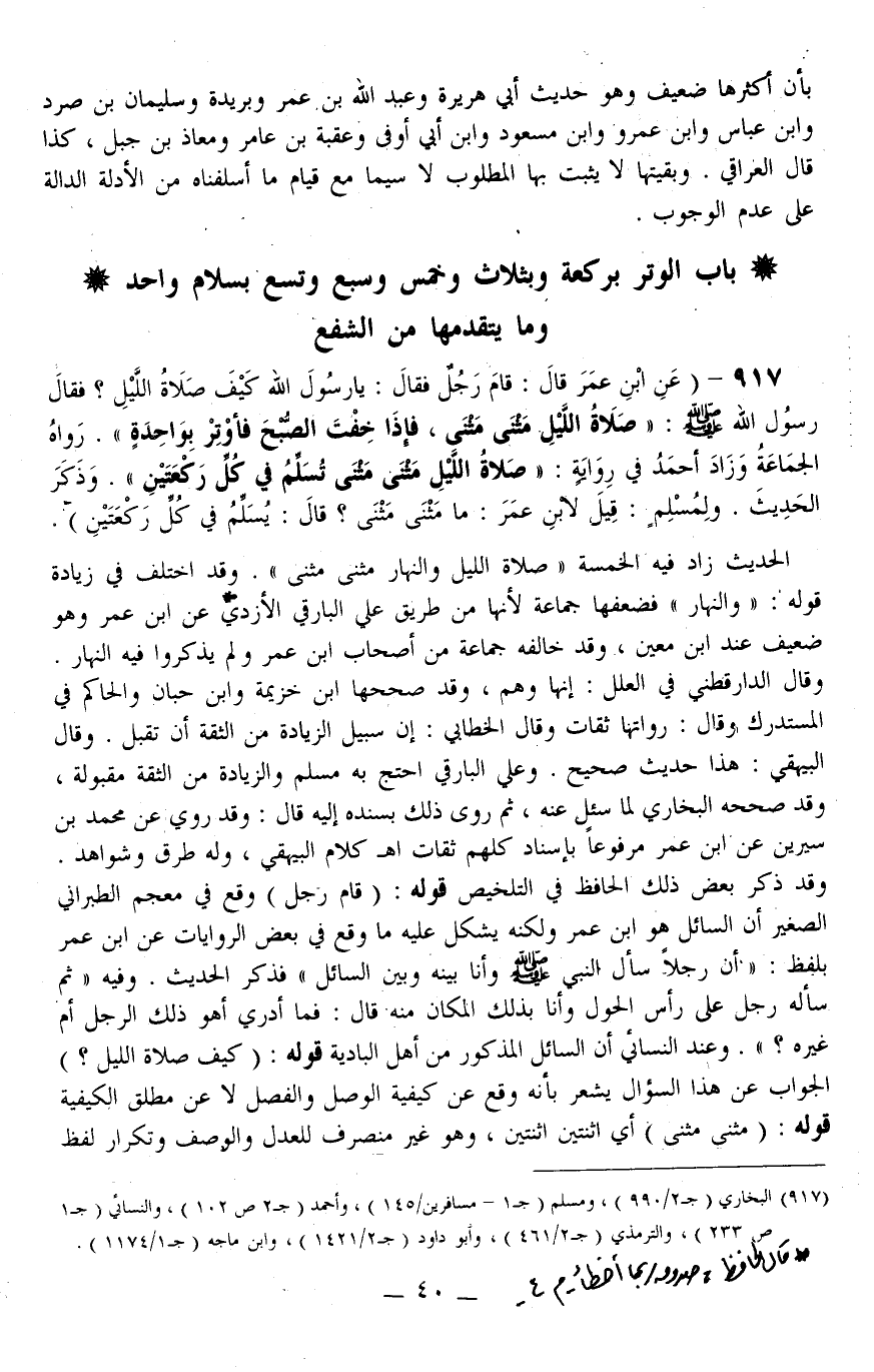 917 - (عَنْ ابْنِ عُمَرَ قَالَ: قَامَ رَجُلٌ فَقَالَ: يَا رَسُولَ اللَّهِ كَيْفَ صَلَاةُ اللَّيْلِ؟ فَقَالَ رَسُولُ اللَّهِ - صَلَّى اللَّهُ عَلَيْهِ وَسَلَّمَ -: «صَلَاةُ اللَّيْلِ مَثْنَى مَثْنَى، فَإِذَا خِفْتَ الصُّبْحَ فَأَوْتِرْ بِوَاحِدَةٍ» . رَوَاهُ الْجَمَاعَةُ وَزَادَ أَحْمَدُ فِي رِوَايَةٍ: «صَلَاةُ اللَّيْلِ مَثْنَى مَثْنَى تُسَلِّمُ فِي كُلِّ رَكْعَتَيْنِ» . وَذَكَرَ الْحَدِيثَ. وَلِمُسْلِمٍ: قِيلَ لِابْنِ عُمَرَ: مَا مَثْنَى مَثْنَى؟ قَالَ: يُسَلِّم فِي كُلِّ رَكْعَتَيْنِ)