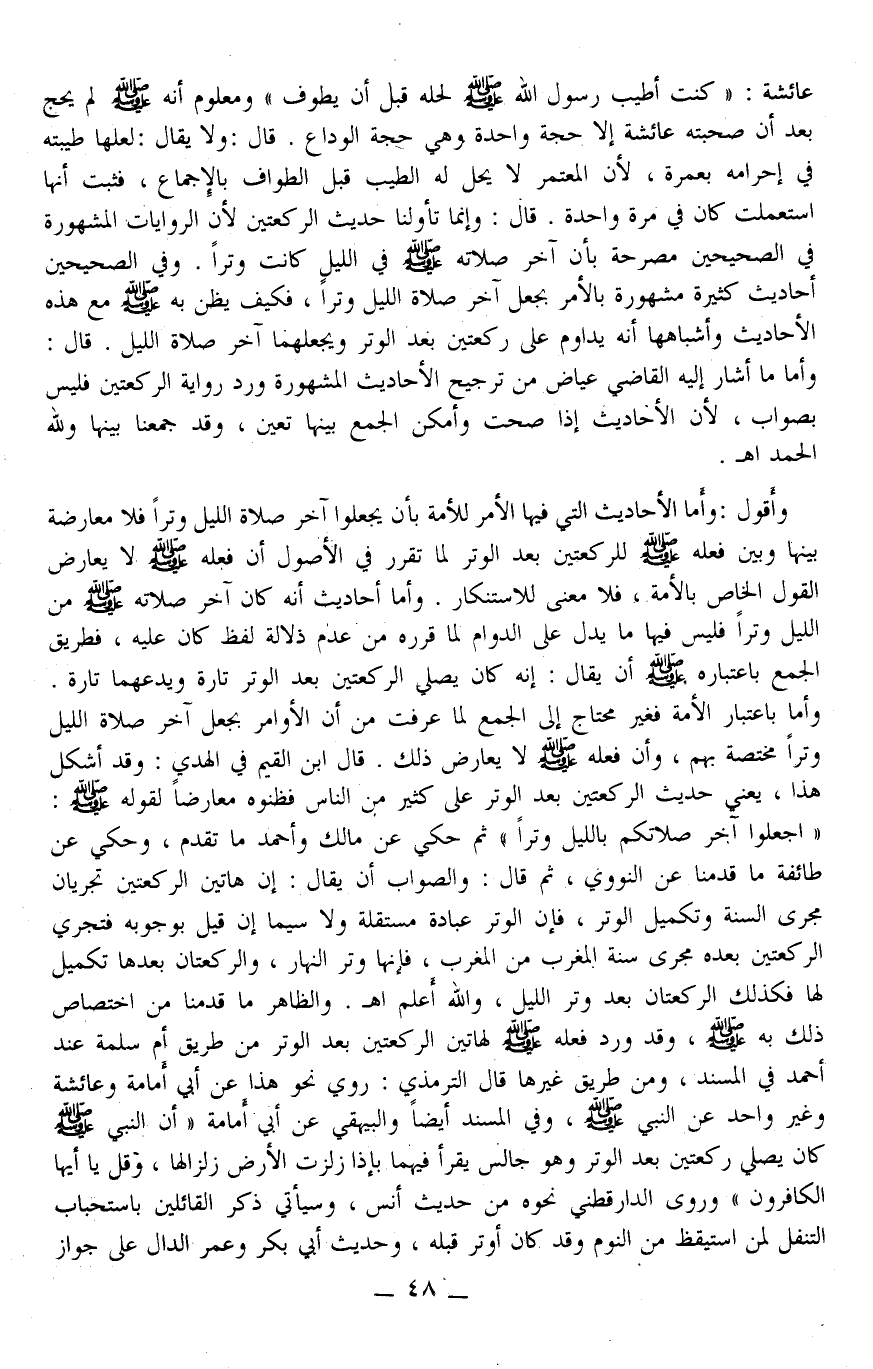 وَأَمَّا أَحَادِيثُ أَنَّهُ كَانَ آخِر صَلَاتِهِ - صَلَّى اللَّهُ عَلَيْهِ وَسَلَّمَ - مِنْ اللَّيْل وِتْرًا فَلَيْسَ فِيهَا مَا يَدُلُّ عَلَى الدَّوَامِ لِمَا قَرَّرَهُ مِنْ عَدَمِ دَلَالَةِ لَفْظِ كَانَ عَلَيْهِ، فَطَرِيقُ الْجَمْعِ بِاعْتِبَارِهِ - صَلَّى اللَّهُ عَلَيْهِ وَسَلَّمَ - أَنْ يُقَالَ: إنَّهُ كَانَ يُصَلِّي الرَّكْعَتَيْنِ بَعْدَ الْوِتْرِ تَارَةً، وَيَدَعهُمَا تَارَةً. وَأَمَّا بِاعْتِبَارِ الْأُمَّةِ فَغَيْرُ مُحْتَاجٍ إلَى الْجَمْعِ لِمَا عَرَفْتَ مِنْ أَنَّ الْأَوَامِرَ بِجَعْلِ آخِرِ صَلَاةِ اللَّيْلِ وِتْرًا مُخْتَصَّةٌ بِهِمْ، وَأَنَّ فِعْلَهُ - صَلَّى اللَّهُ عَلَيْهِ وَسَلَّمَ - لَا يُعَارِضُ ذَلِكَ