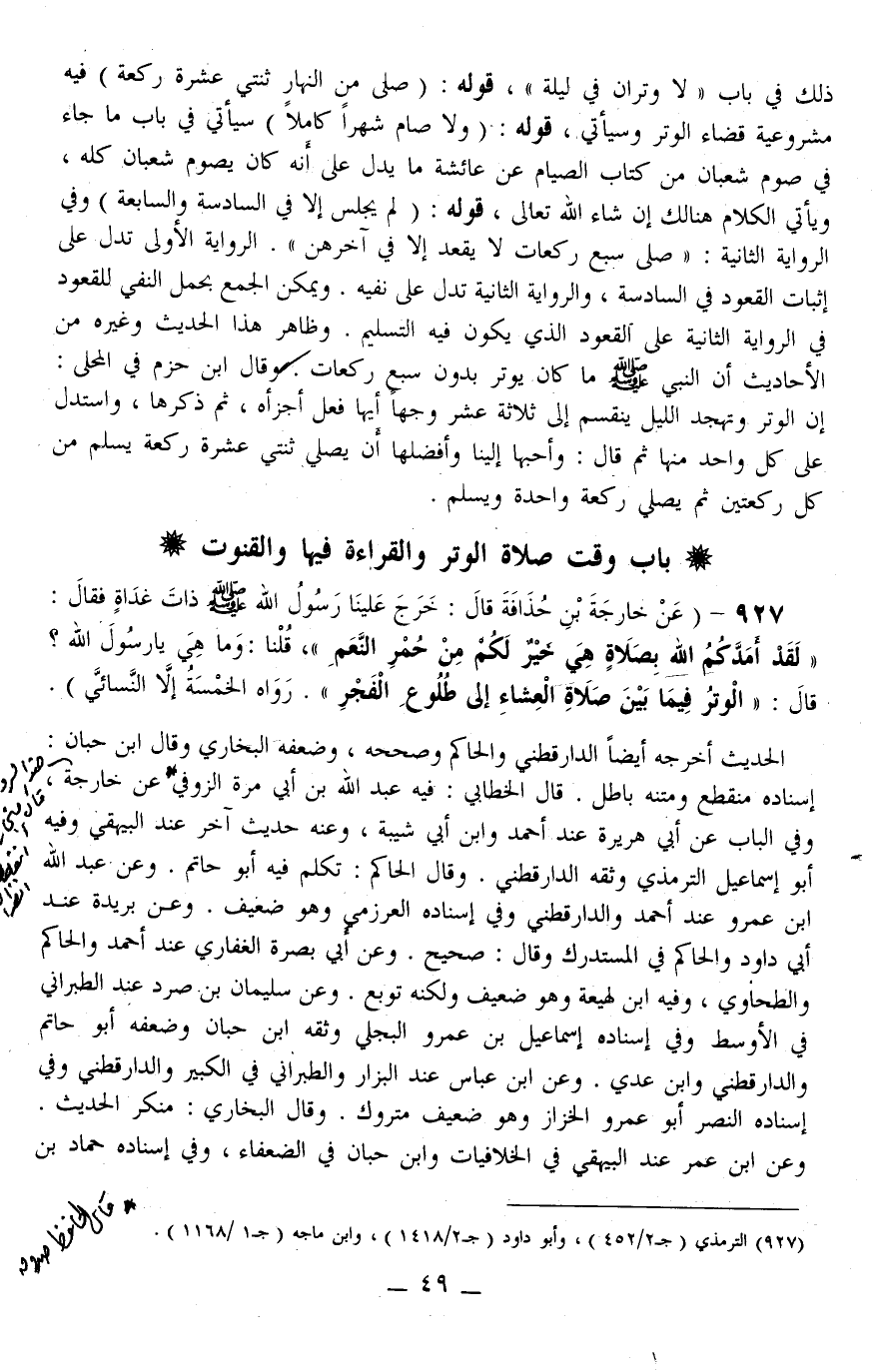 927 - (عَنْ خَارِجَةَ بْنِ حُذَافَةَ قَالَ: «خَرَجَ عَلَيْنَا رَسُولُ اللَّهِ - صَلَّى اللَّهُ عَلَيْهِ وَسَلَّمَ - ذَاتَ غَدَاةٍ فَقَالَ: لَقَدْ أَمَدَّكُمْ اللَّهُ بِصَلَاةٍ هِيَ خَيْرٌ لَكُمْ مِنْ حُمْرِ النَّعَمِ، قُلْنَا: وَمَا هِيَ يَا رَسُولَ اللَّهِ؟ قَالَ: الْوِتْرُ فِيمَا بَيْنَ صَلَاةِ الْعِشَاءِ إلَى طُلُوعِ الْفَجْرِ» . رَوَاهُ الْخَمْسَة إلَّا النَّسَائِيَّ) .