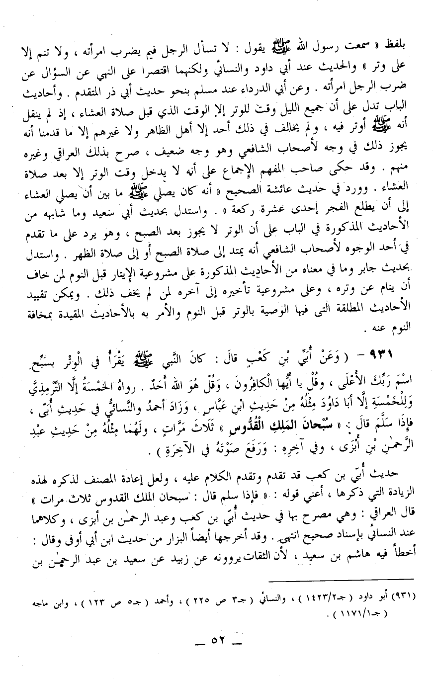 931 - (وَعَنْ أُبَيِّ بْنِ كَعْبٍ قَالَ: «كَانَ النَّبِيُّ - صَلَّى اللَّهُ عَلَيْهِ وَسَلَّمَ - يَقْرَأُ فِي الْوِتْرِ بِ {سَبِّحِ اسْمَ رَبِّكَ الأَعْلَى} [الأعلى: 1] ، وَ {قُلْ يَا أَيُّهَا الْكَافِرُونَ} [الكافرون: 1] ، وَ {قُلْ هُوَ اللَّهُ أَحَدٌ} [الإخلاص: 1] » . رَوَاهُ الْخَمْسَةُ إلَّا التِّرْمِذِيَّ وَلِلْخَمْسَةِ إلَّا أَبَا دَاوُد مِثْلُهُ مِنْ حَدِيثِ ابْنِ عَبَّاسٍ، وَزَادَ أَحْمَدُ وَالنَّسَائِيُّ فِي حَدِيثِ أُبَيٍّ، «فَإِذَا سَلَّمَ قَالَ: سُبْحَانَ الْمَلِكِ الْقُدُّوسِ ثَلَاثَ مَرَّاتٍ» وَلَهُمَا مِثْلُهُ مِنْ حَدِيثِ عَبْدِ الرَّحْمَنِ بْنِ أَبْزَى، وَفِي آخِرِهِ: وَرَفَعَ صَوْتَهُ فِي الْآخِرَةِ)