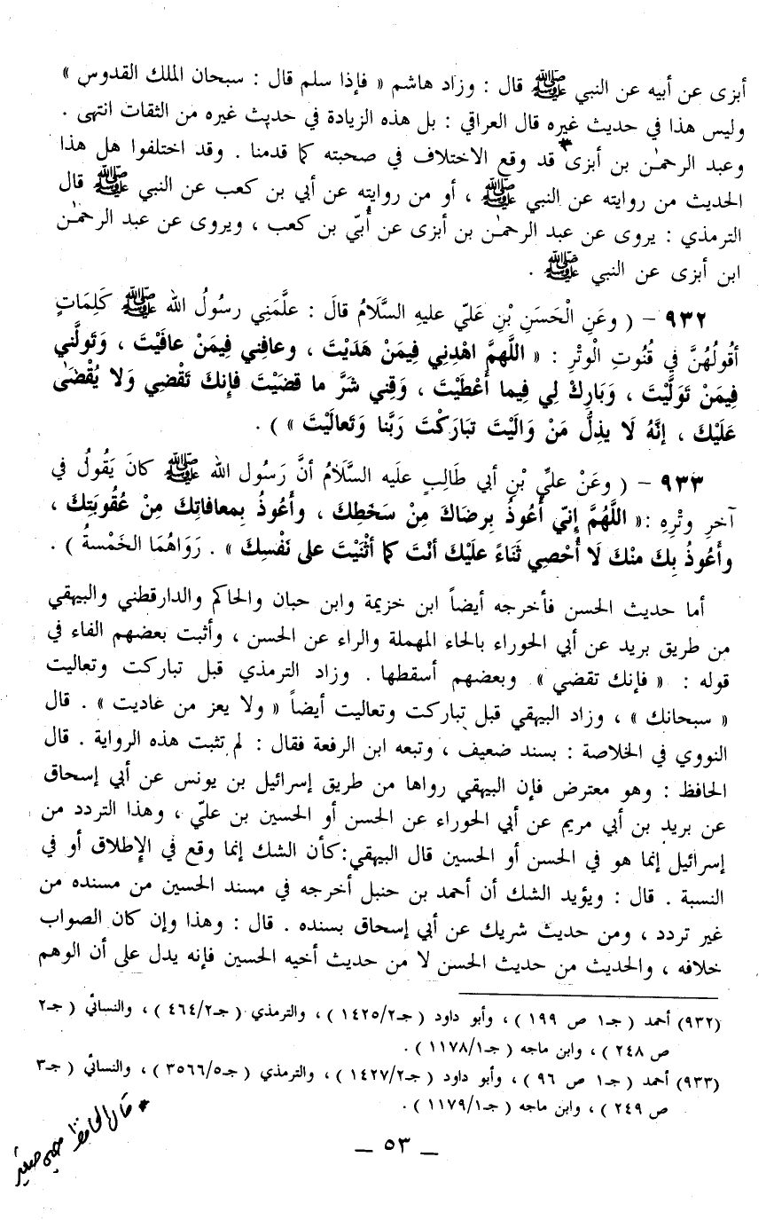 قَالَ النَّوَوِيُّ فِي الْخُلَاصَةِ: بِسَنَدٍ ضَعِيفٍ، وَتَبِعَهُ ابْنُ الرِّفْعَةِ فَقَالَ: لَمْ تَثْبُتْ هَذِهِ الرِّوَايَةُ قَالَ الْحَافِظُ: وَهُوَ مُعْتَرَضٌ فَإِنَّ الْبَيْهَقِيَّ رَوَاهَا مِنْ طَرِيقِ إسْرَائِيلَ بْنِ يُونُسَ عَنْ أَبِي إِسْحَاقَ عَنْ بُرَيْدٍ بْنِ أَبِي مَرْيَمَ عَنْ أَبِي الْحَوْرَاءِ عَنْ الْحَسَنِ أَوْ الْحُسَيْنِ بْنِ عَلِيِّ، وَهَذَا التَّرَدُّدُ مِنْ إسْرَائِيلَ إنَّمَا هُوَ فِي الْحَسَنِ أَوْ الْحُسَيْنِ قَالَ الْبَيْهَقِيُّ: كَأَنَّ الشَّكَّ إنَّمَا وَقَعَ فِي الْإِطْلَاقِ أَوْ فِي النِّسْبَةِ.