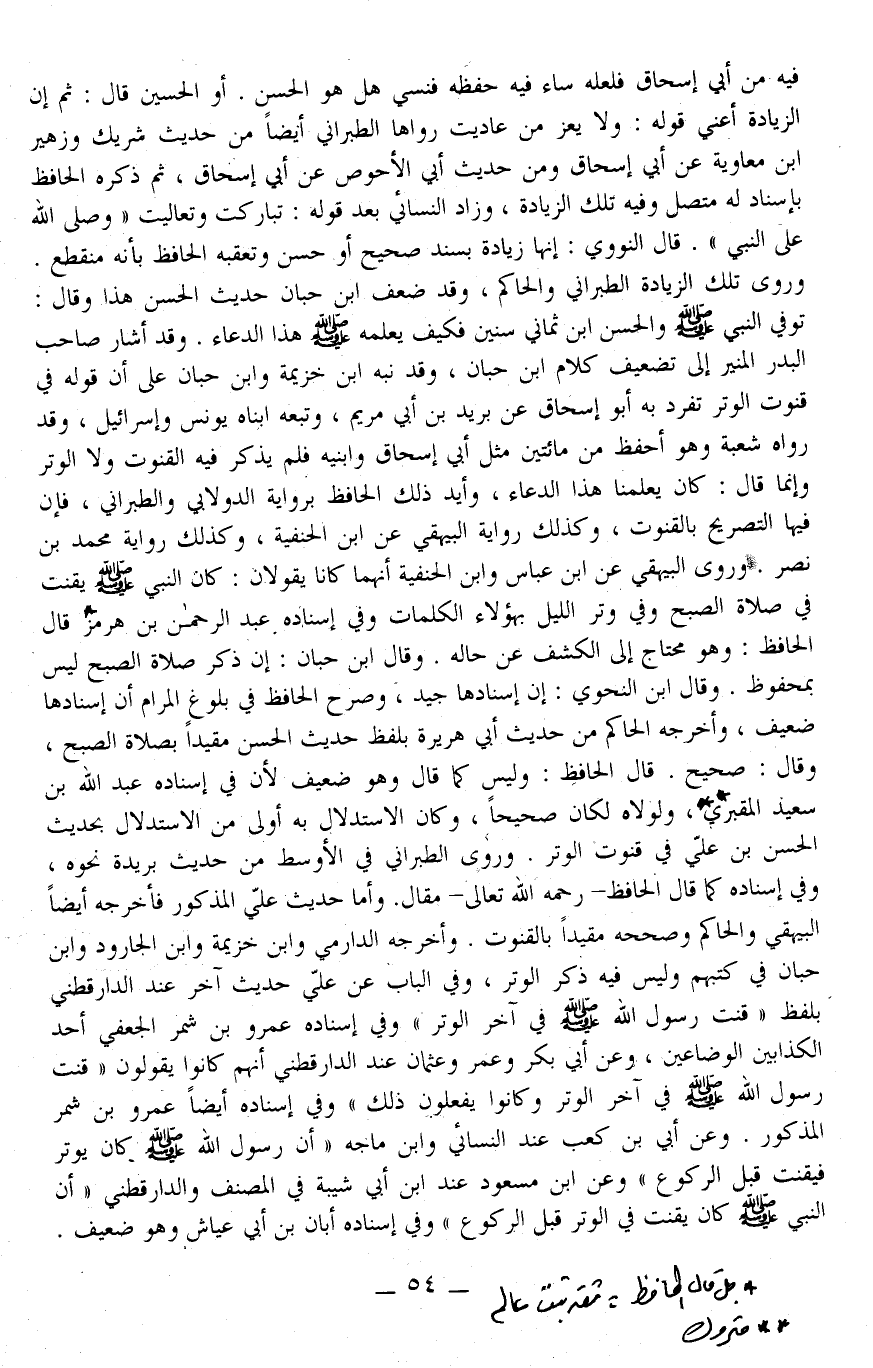 ـــــــــــــــــــــــــــــQفِيهِ مِنْ أَبِي إِسْحَاقَ، فَلَعَلَّهُ سَاءَ فِيهِ حِفْظِهِ فَنَسِيَ هَلْ هُوَ الْحَسَنُ أَوْ الْحُسَيْنُ؟ قَالَ: ثُمَّ إنَّ الزِّيَادَةَ أَعْنِي قَوْلُهُ: وَلَا يَعِزُّ مَنْ عَادَيْتَ رَوَاهَا الطَّبَرَانِيُّ أَيْضًا مِنْ حَدِيث شَرِيكٍ وَزُهَيْرِ بْنِ مُعَاوِيَةَ عَنْ أَبِي إِسْحَاقَ وَمِنْ حَدِيثِ أَبِي الْأَحْوَصِ عَنْ أَبِي إِسْحَاقَ، ثُمَّ ذَكَرَهُ الْحَافِظُ بِإِسْنَادٍ لَهُ مُتَّصِلٍ، وَفِيهِ تِلْكَ الزِّيَادَةُ، وَزَادَ النَّسَائِيّ بَعْد قَوْلِهِ: تَبَارَكْتَ وَتَعَالَيْتَ " وَصَلَّى اللَّهُ عَلَى النَّبِيِّ ".